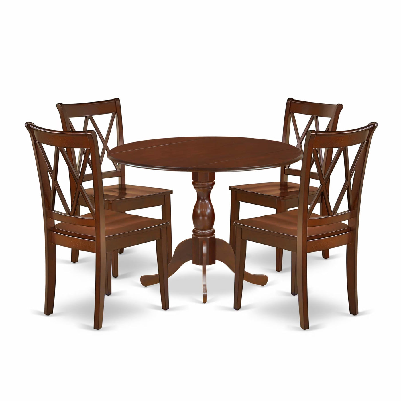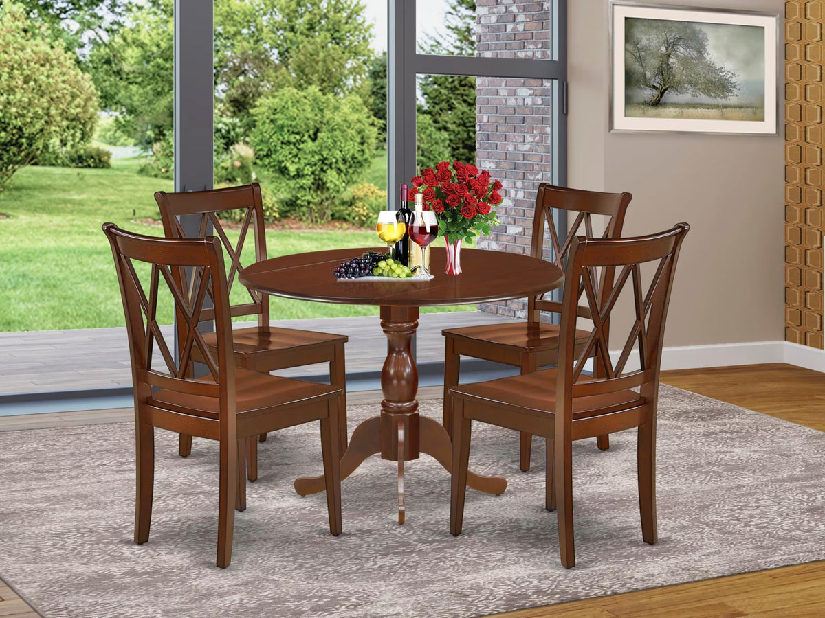 EAST WEST FURNITURE - DMCL5-MAH-W - 5-PC DINING TABLE SETThe 5 Piece dining room table set by East West Furniture is truly marvelous, consisting of a round pedestal dining table with drop leaves and 4 matching dining chairs. The chairs boast an elegant design that seamlessly complements any decor, with a contemporary Double X-Back that blends beautifully with a solid wood seat for a sophisticated appearance. The dining table, designed in classical style and finished in a rich Mahogany color, perfectly matches the wooden dining chairs for a more attractive overall appearance. The spacious tabletop, crafted from high-quality Rubber Wood material, ensures heightened toughness and long-lasting use. Assembly is a breeze, thanks to the easy and fast design, and each set comes with all necessary tools and easy-to-follow instructions. Cleaning is also simple, as the brush finish is smooth and can be wiped down with a damp cloth and furniture cleanser. Enjoy this beautiful dining set by East West Furniture!PRODUCT FEATURES: Seat Material: Wooden Color: Mahogany Chair Back Style: Double X-Back Dimension of Table: Length: 42; Width: 42; Height: 29.5. Chair Dimension: Length: 22; Width: 18; Height: 37.Include in this Package: 4 Dining Chairs and A Wood Table.