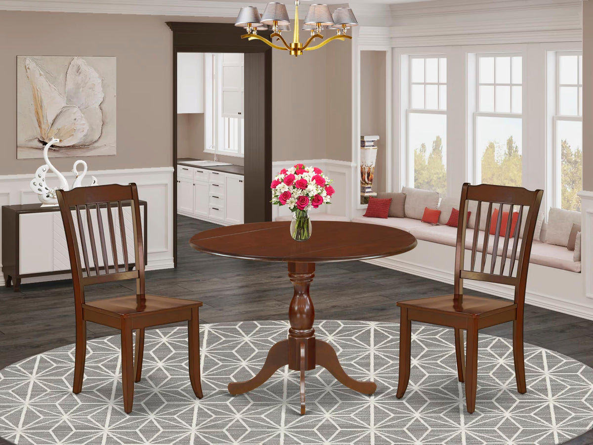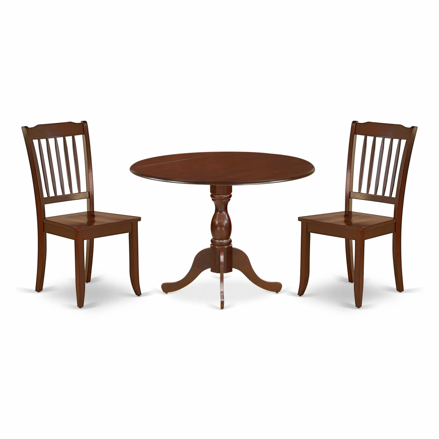 East West Furniture DMDA3-MAH-W 3 Piece Kitchen Table & Chairs Set Contains a Round Dining Room Table with Dropleaf and 2 Solid Wood Seat Chairs, 42x42 Inch, Mahogany