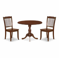 EAST WEST FURNITURE - DMDA3-MAH-W - 3-PC DINING SETThe Sophisticated 3 Piece dinette set includes 1 Drop Leaves wooden dining room table and 2 matching dining chairs. Our dining chair adds a sense of sophistication to your room and the modern design is compatible seamlessly with any décor. The contemporary slatted back of this dining chair blends beautifully with the solid wood seat, creating a sophisticated appeal. This kitchen table is designed in classical style. In addition, the Mahogany color match with dinning room chairs making its appeal more attractive. The Spacious tabletop created from premium quality Rubber Wood material help for heightened durability and long-lasting use. Designed with easy and fast assembly in mind, each set comes conveniently packed with easy to follow instructions and all necessary tools included. Our wood dining table set is simple to clean with a damp cloth and furniture cleanser because their brush finish is smooth. Enjoy with East West Furniture!WOOD DINING TABLE SET FEATURES: Seat Material: Wooden Chair Color: Mahogany Kitchen Table Top Color: Mahogany Dining Table Legs Color: Mahogany Dining Chairs Legs Color: Mahogany Chair Back Style: Slatted Back Dimension of Table: Length: 42; Width: 42; Height: 29.5 Chair Dimension: Length: 22; Width: 18; Height: 38.Includein this Modern Dining Table Set - 2 Dinning Room Chairs and 1 Modern Dining Room Table.
