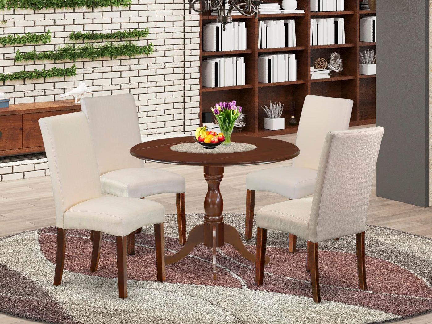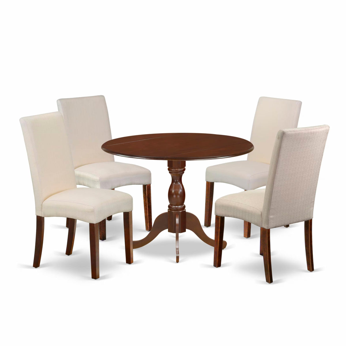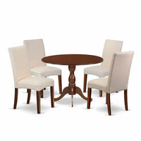East West Furniture DMDR5-MAH-01 5 Piece Modern Dining Table Set Includes a Round Wooden Table with Dropleaf and 4 Cream Linen Fabric Parson Dining Room Chairs, 42x42 Inch, Mahogany