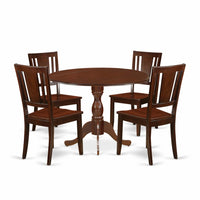 EAST WEST FURNITURE - DMDU5-MAH-W - 5-PC DINING ROOM TABLE SETThe 5 Piece dining room table set is an elegant addition to any home. It comprises of a Drop Leaves dining room table and 4 matching mid century chairs that exude a sense of sophistication. The innovative design of the wood chair seamlessly complements any decor. The contemporary Panel Back of the wood dining chairs blends beautifully with the wood seat, creating a refined appeal. The round table is designed in a classical style, with a Mahogany color that matches the wooden kitchen chairs, making it even more attractive. The Spacious tabletop is made of high-quality Rubber Wood material, ensuring heightened durability and long-lasting use. The set is designed with easy and fast assembly in mind, and comes packed with easy-to-follow instructions and all necessary tools. The kitchen table set is simple to clean with a damp cloth and furniture cleanser, thanks to its smooth brush finish. Enjoy the beauty and functionality of the East West Furniture dining room table set.PRODUCT FEATURES: Seat Material: Wooden Color: Mahogany Chair Back Style: Panel Back Dimension of Table: Length: 42; Width: 42; Height: 29.5. Chair Dimension: Length: 21; Width: 17; Height: 38.Include in The Package: 4 Dining Chairs and A Round Table.