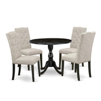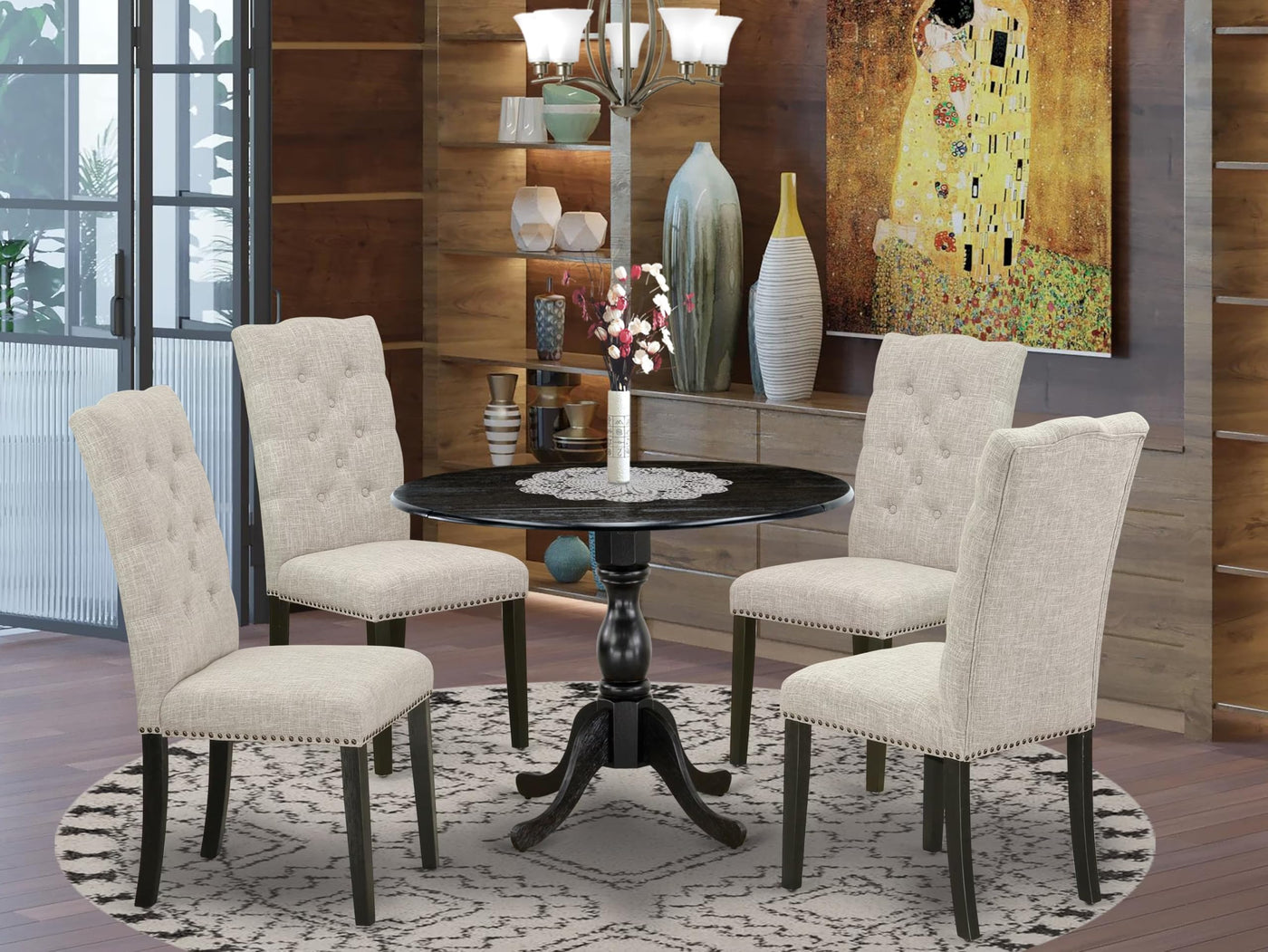 East West Furniture DMEL5-ABK-35 5 Piece Modern Dining Table Set Includes a Round Wooden Table with Dropleaf and 4 Doeskin Linen Fabric Upholstered Chairs, 42x42 Inch, Wirebrushed Black