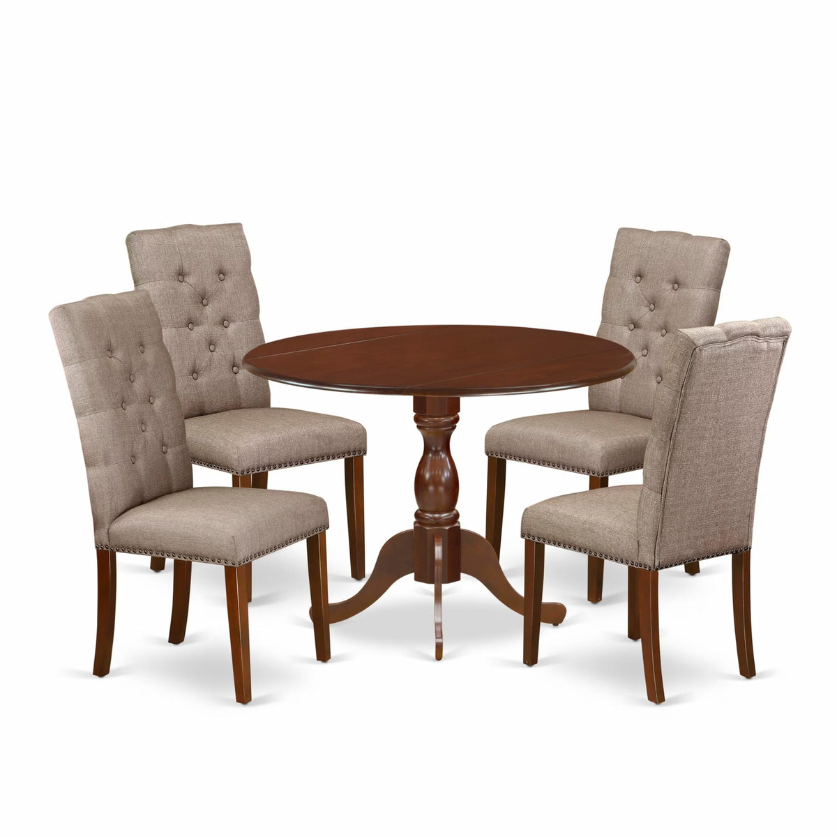 EAST WEST FURNITURE - DMEL5-MAH-16 - 5-PIECE KITCHEN TABLE SETThe 5-piece wood dining table set is an exceptional addition to any dining room. The set comprises a drop leaves dining table and 4 matching upholstered dining chairs, which exude elegance and seamlessly blend with any decor. The parson dining chairs feature a contemporary button-tufted chair back that perfectly complements the linen fabric seat, creating a sophisticated appearance. These chairs boast superior craftsmanship, with soft linen fabric upholstery, fine nailhead trim with spring support, comfortable padded cushioning, and a solid natural wood frame. The round dining table features a classic design and is colored in a rich mahogany that matches the linen fabric padded chairs, giving it a visually appealing look. The spacious tabletop is constructed from high-quality rubber wood material, ensuring durability and long-lasting use. This dining set is easy to assemble, with all necessary tools and easy-to-follow instructions included. It is also budget-friendly, making it an excellent choice for those seeking a comfortable, durable, and contemporary dining set that provides an enjoyable dining experience with family and friends.PRODUCT FEATURES: Fabric Type: Linen Fabric Linen Fabric Color: Dark Khaki Color: Mahogany Chair Back Style: Button Tufted Dimension of Table: Length: 42; Width: 42; Height: 29.5. Chair Dimension: Length: 24.5; Width: 19; Height: 40.5.Include in the Package: 4 Dining Chair and A Modern Dining Table.