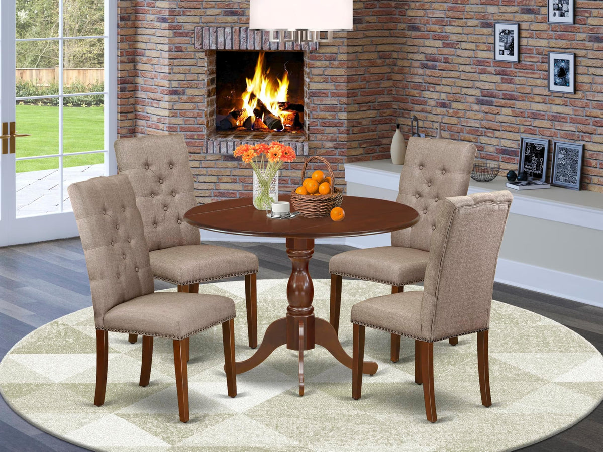 East West Furniture DMEL5-MAH-16 5 Piece Dining Table Set for 4 Includes a Round Kitchen Table with Dropleaf and 4 Dark Khaki Linen Fabric Parsons Dining Chairs, 42x42 Inch, Mahogany