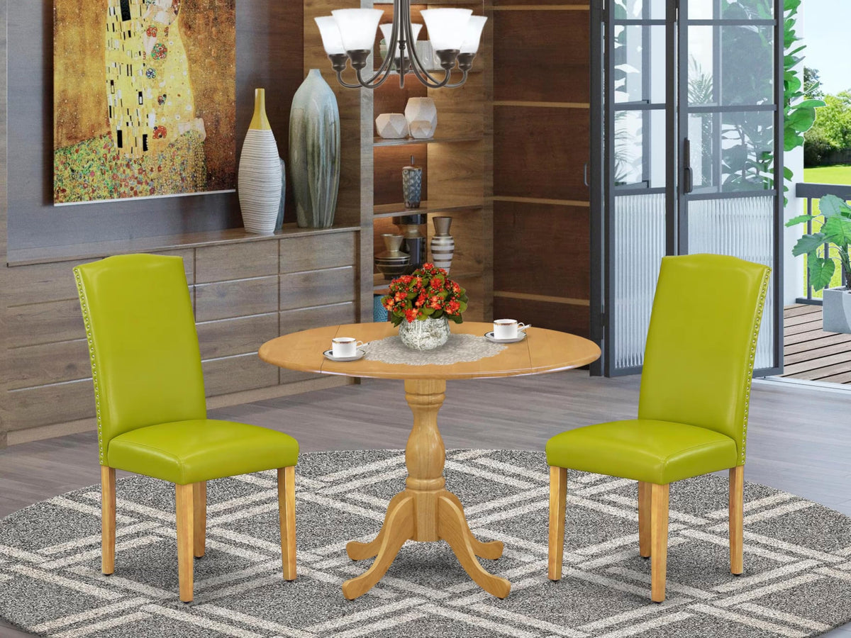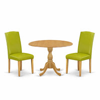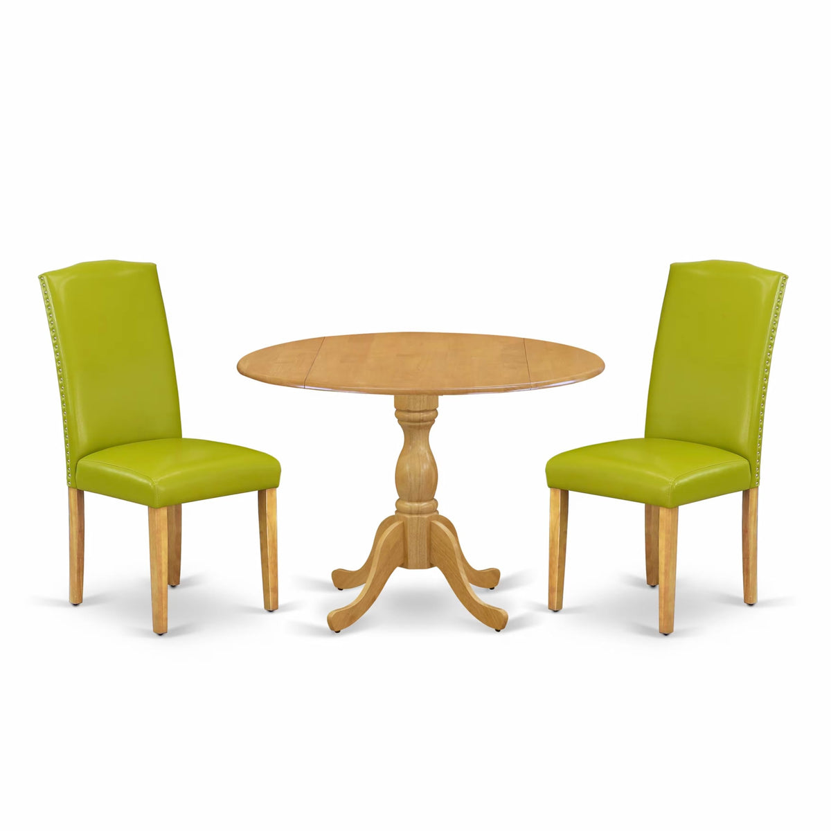 East West Furniture DMEN3-OAK-51 3 Piece Dining Set for Small Spaces Contains a Round Dining Room Table with Dropleaf and 2 Autumn Green Faux Leather Parson Chairs, 42x42 Inch, Oak
