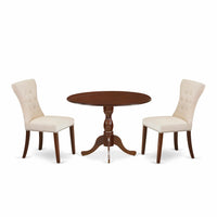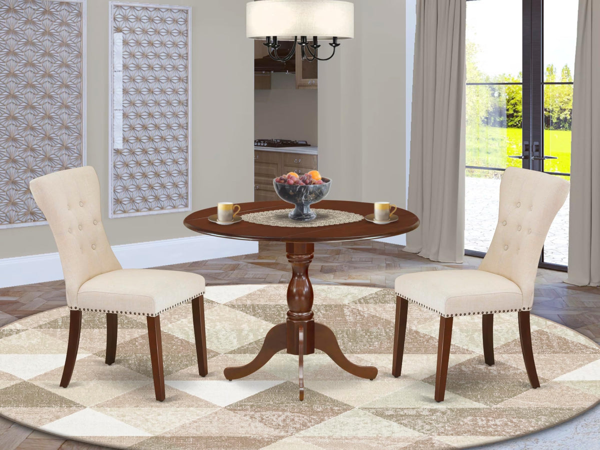 East West Furniture DMGA3-MAH-32 3 Piece Dining Set Contains a Round Dining Room Table with Dropleaf and 2 Light Beige Linen Fabric Upholstered Chairs, 42x42 Inch, Mahogany