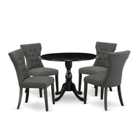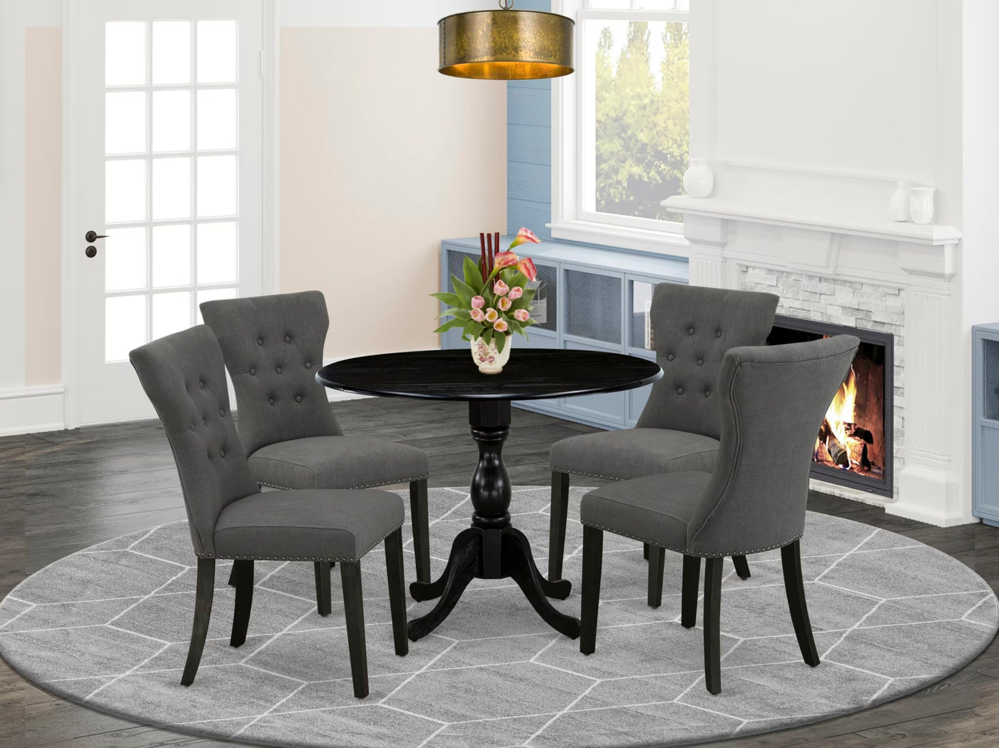EAST WEST FURNITURE - DMGA5-ABK-50 - 5-PC WOODEN DINING TABLE SETThe Sophisticated 5 Piece dining table set features 2 Drop Leaves dining tables and 4 matching parson chairs, adding elegance to your space. The modern design of the dining room chair seamlessly complements any decor, and the contemporary Button Tufted Chair Back of this padded chair beautifully blends with the Linen Fabric seat, creating a sophisticated look. The chair boasts soft Linen Fabric upholstery, fine nailhead trim with spring support, a comfortable padded cushion, and a solid natural wood frame. The dining table is designed in a classical style and has a Black color that matches the Linen Fabric dining chair, making its appearance more attractive. The Spacious tabletop is made of top-quality Rubber Wood material for heightened durability and long-lasting use. This wooden table set is designed for easy and fast assembly, and it comes with all the necessary tools and easy-to-follow instructions. This contemporary, budget-friendly, durable, and comfortable furniture set is an excellent choice for those seeking a great dining experience with family and friends.PRODUCT FEATURES: Fabric Type: Linen Fabric Fabric Color: Dark Gotham Grey Table Legs Color: Wire Brushed Black Color: Black Chair Back Style: Button Tufted Dimension of Table: Length: 42; Width: 42; Height: 29.5. Chair Dimension: Length: 23; Width: 18; Height: 36.Include in The Package: 4 Mid Century Dining Chairs and A Round Table.