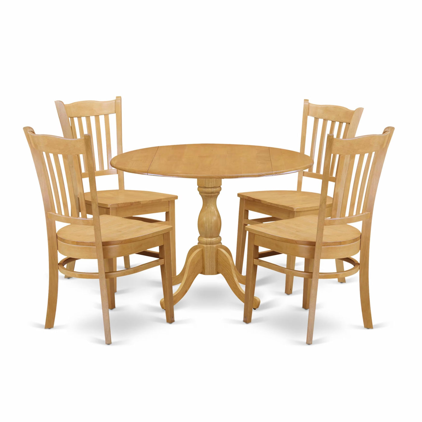 EAST WEST FURNITURE - DMGR5-OAK-W - 5-Pc KITCHEN TABLE SETOur 5-Piece kitchen set includes a round dining table and 4 wood chairs, providing ample space for your family to dine together. The kitchen dining table set features a sophisticated and eye-catching appearance, with a classy design and Rustic, Oak kitchen chair that is perfect for matching any dining room decor. Upgrade your home decor with our antique-style kitchen table set, which adds a unique allure with its Oak textured finish. The wooden legs of both wooden chairs and the dining table enhance its solidness and traditional feel. The contemporary-style kitchen dining table set adds a touch of elegance to your home that you and your family will absolutely enjoy. The wooden chairs provide an incredibly relaxing experience with their slatted back and cone-shaped legs. Featuring a smooth surface, this kitchen dining table set is easy to clean with a simple wipe down for hassle-free maintenance. Assembly of our table set takes little time and is easy to assemble if you follow the step-by-step instructions.PRODUCT FEATURES: Wood Type: Asian Wood Chairs Back Style: Slatted Back Color: Oak Chairs Dimension: Length: 21; Width: 18; Height: 37. Dimension of Table: Length: 42; Width: 42; Height: 29.5.Includes A Wood Dining Table and 4 Dining Chairs.