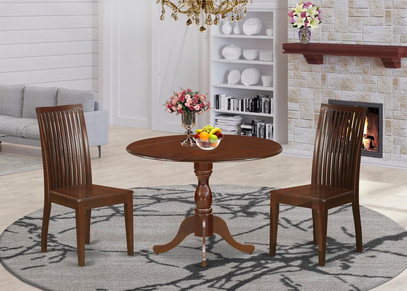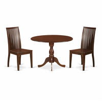 EAST WEST FURNITURE - DMIP3-MAH-W - 3-PIECE TABLE SETThis set includes a round table and two dining chairs made of wood that can comfortably seat your entire family. It offers an elegant and refined appearance for your dining area. The chairs, with a rustic design and mahogany finish, will complement any kitchen decor. Upgrade the look of your kitchen with this rustic-style table set, which features a unique mahogany finish that adds charm to any dining room. The wooden legs of both the chairs and table create a solid and traditional feel. This modern-style table set adds sophistication to your kitchen, and you and your family will surely enjoy it. The slatted back and cone-shaped legs of the wooden chairs provide comfort and a pleasant experience. The dropleaf mid century modern dining table and kitchen chairs are easy to clean due to their smooth surface, and maintenance is hassle-free with just a simple wipe down. Assembling the set is quick and easy, just follow the step-by-step instructions.PRODUCT FEATURES: Wood Type: Asian Wood Color: Mahogany Chairs Dimension: Length: 21; Width: 18; Height: 39. Dimension of Table: Length: 42; Width: 42; Height: 29.5.Include in the Package: A Wood Table with 2 Dining Chairs.