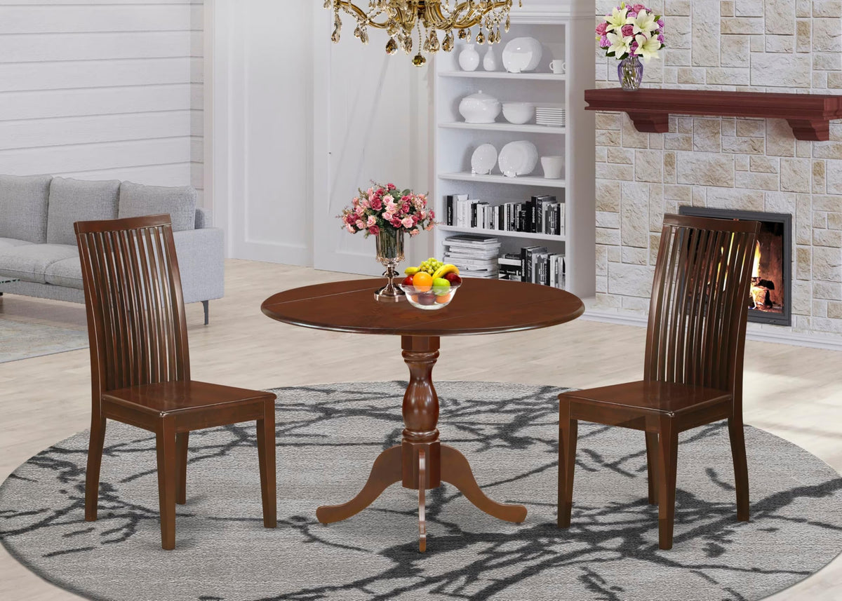 East West Furniture DMIP3-MAH-W 3 Piece Kitchen Table & Chairs Set Contains a Round Dining Room Table with Dropleaf and 2 Dining Chairs, 42x42 Inch, Mahogany