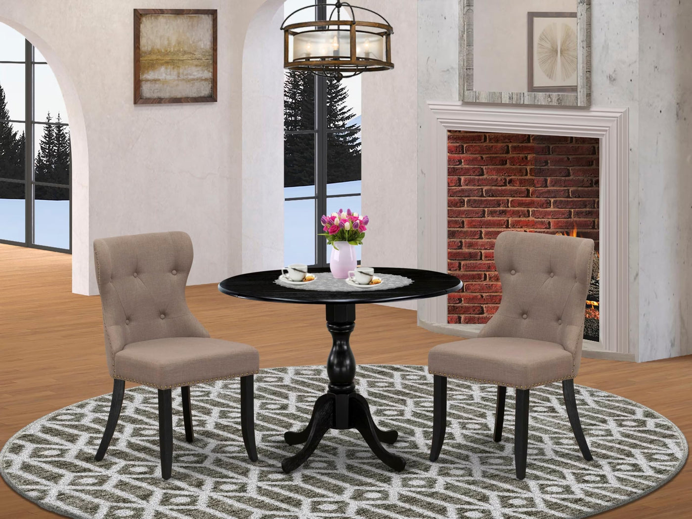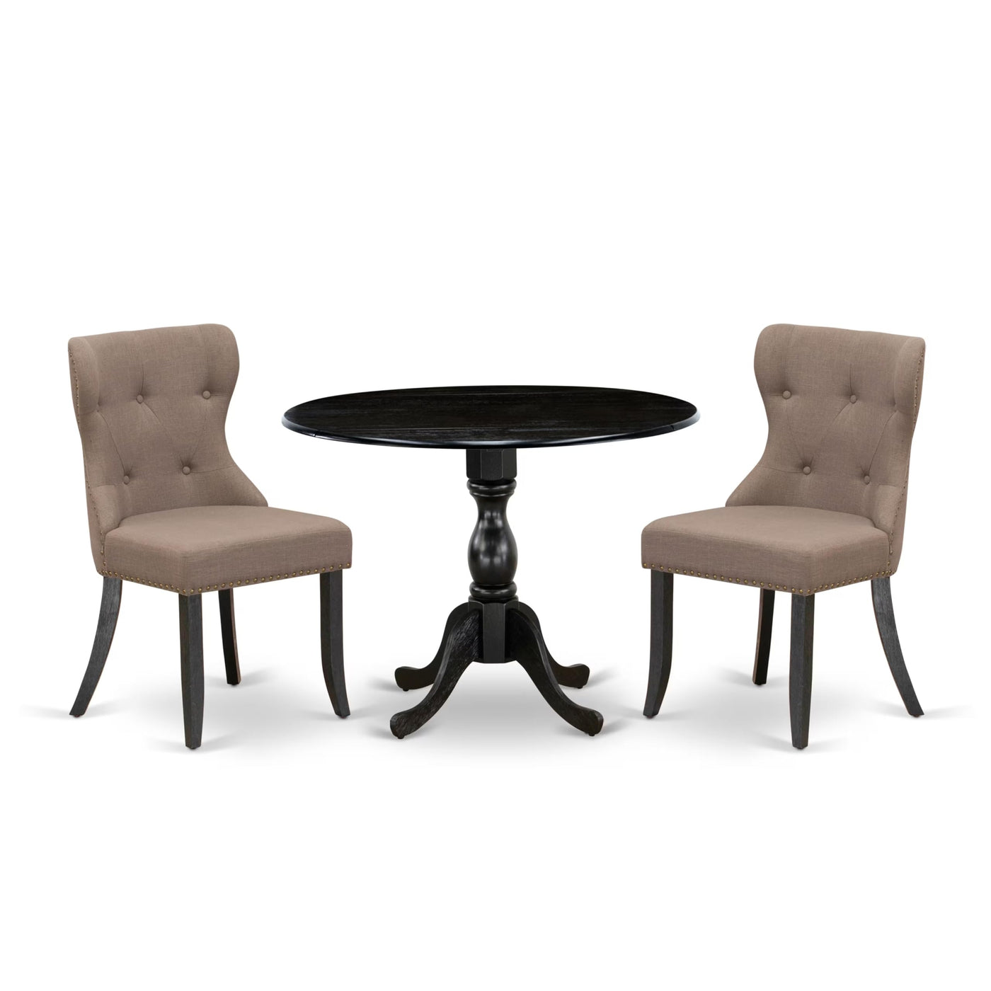 EAST WEST FURNITURE - DMSI3-ABK-48 - 3-PC WOOD DINING TABLE SETOur 3-Piece dining table set features 2 drop-leaf dining tables and 2 mid-century style dining chairs. The elegant design adds a touch of sophistication to any room and seamlessly complements any decor. The contemporary button-tufted chair back of the kitchen parson dining chair blends beautifully with the linen fabric seat, creating a modern appearance. The soft linen fabric upholstery, fine nailhead trim, comfortable padded cushion, and solid natural wood frame make this chair high-quality in both design and comfort. The round dining table is designed in a classical style, and the black color matches with the linen fabric parsons chair, enhancing its appearance. The spacious tabletop is made of superior-quality rubberwood material for heightened durability and long-lasting use. Designed for easy and fast assembly, each set comes conveniently packed with easy-to-follow instructions and all necessary tools included. This contemporary, budget-friendly, durable, and comfortable kitchen set is a great choice for a wonderful dining experience with family and friends.PRODUCT FEATURES: Fabric Type: Linen Fabric Fabric Color: Coffee Table Legs Color: Wire Brushed Black Color: Black Chair Back Style: Button Tufted Dimension of Table: Length: 42; Width: 42; Height: 29.5. Chair Dimension: Length: 21.5; Width: 19.5; Height: 35.5.Include in The Package: 2 Padded Chair and A Dining Table.