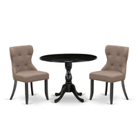 East West Furniture DMSI3-ABK-48 3 Piece Dining Table Set for Small Spaces Contains a Round Dining Room Table with Dropleaf and 2 Coffee Linen Fabric Parson Chairs, 42x42 Inch, Wirebrushed Black