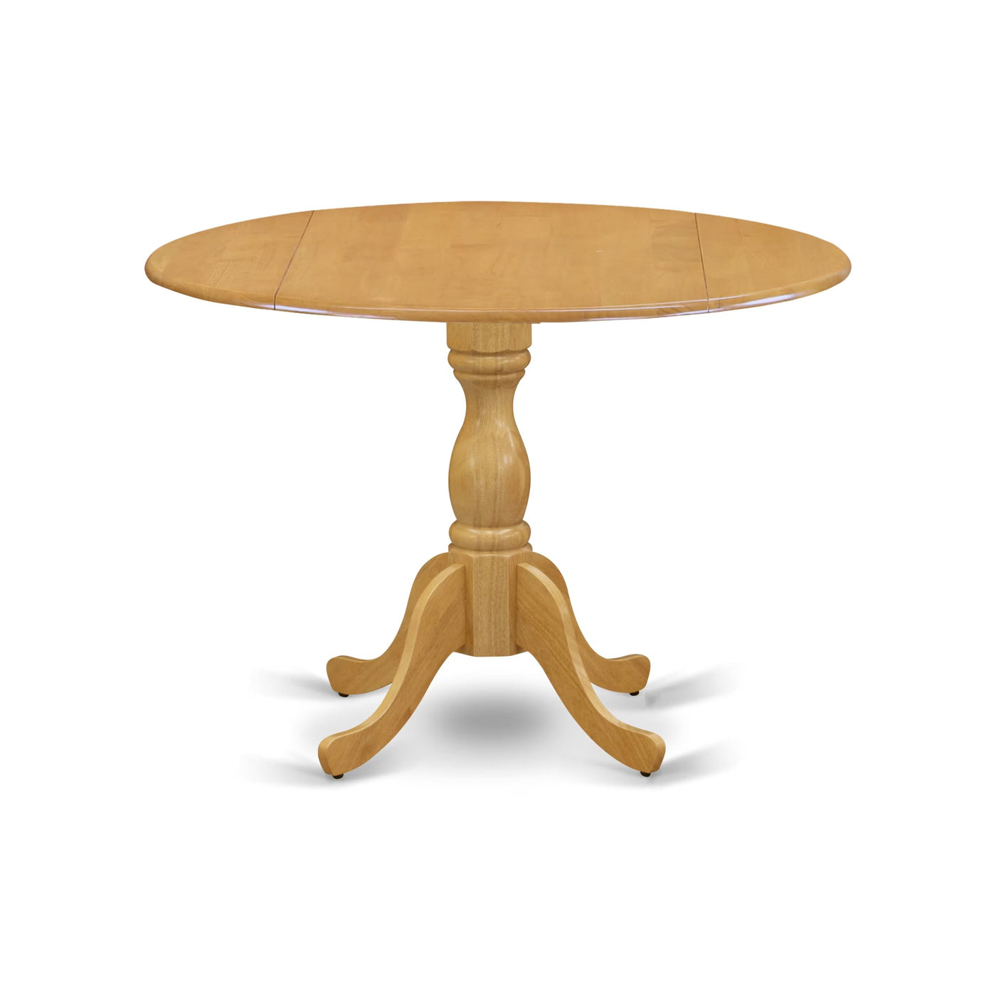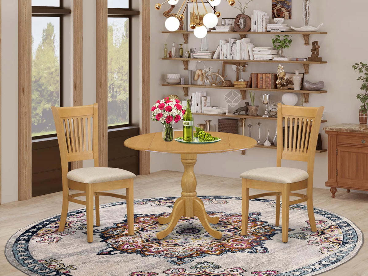 EAST WEST FURNITURE - DMVA3-OAK-C - 3-Pc DINING TABLE SETOur 3-piece kitchen table set includes a round dinner table and 2 wooden dining chairs, providing ample space for your family. This dining set features a sophisticated and eye-catching design, with rustic oak dining chairs that complement any dining room decor. Elevate your interior decor with our traditional design dining table set, featuring an oak textured finish that adds a unique allure to any dining area. The wooden legs of both kitchen chairs and the dining table enhance the solidness and traditional feel of the set. The modern style of this table set adds a touch of elegance to your home, providing you and your family with a fantastic dining experience. The dining room chairs are designed for comfort, featuring a slatted back and cone-shaped legs. The chairs are equipped with Zig Zag springs, also known as No-Sag springs, which are made from two-dimensional S-shaped wires and offer durability and support. The high carbon steel springs can support weight and provide stability to the seats. This dining table set has a smooth surface, making it easy to clean with a simple wipe down for hassle-free maintenance. Assembly is a breeze with our step-by-step instructions, requiring little time to set up.PRODUCT FEATURES: Wood Type: Asian Wood Chairs Back Style: Slatted Back Color: Oak Dimension of Table: Length: 42; Width: 42; Height: 29.5. Chairs Dimension: Length: 20; Width: 17; Height: 37.Include in the Package: 1 Dropleaf Small Kitchen Table and 2 Dining Chairs.