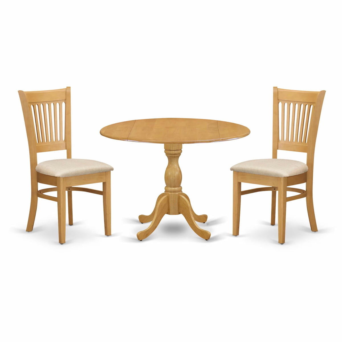 East West Furniture DMVA3-OAK-C 3 Piece Kitchen Table Set for Small Spaces Contains a Round Dining Table with Dropleaf and 2 Linen Fabric Dining Room Chairs, 42x42 Inch, Oak