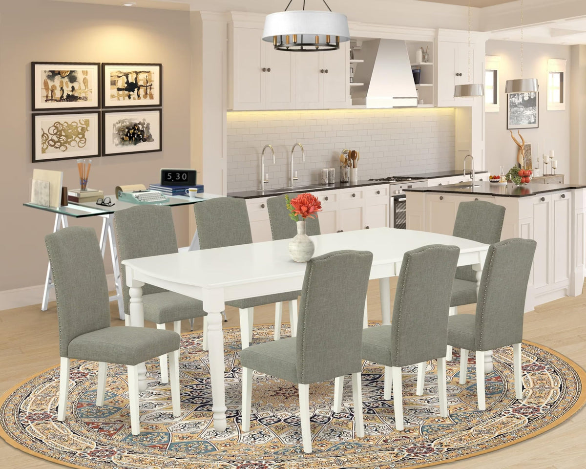 East West Furniture Doen9-Lwh-06 9 Piece Kitchen Table Set Includes A Rectangle Dining Table With Butterfly Leaf And 8 Dark Shitake Linen Fabric Padded Chairs, 42X78 Inch, Linen White