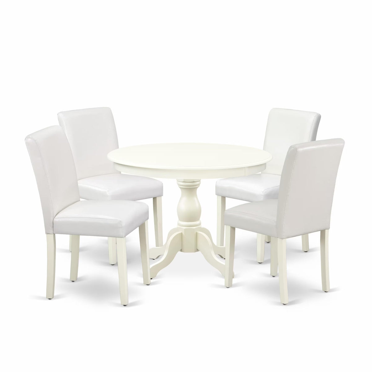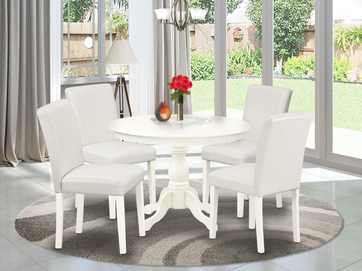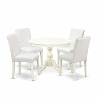 East West Furniture HBAB5-LWH-64 5 Piece Dining Set Includes a Round Dining Room Table with Pedestal and 4 White Faux Leather Upholstered Parson Chairs, 42x42 Inch, Linen White