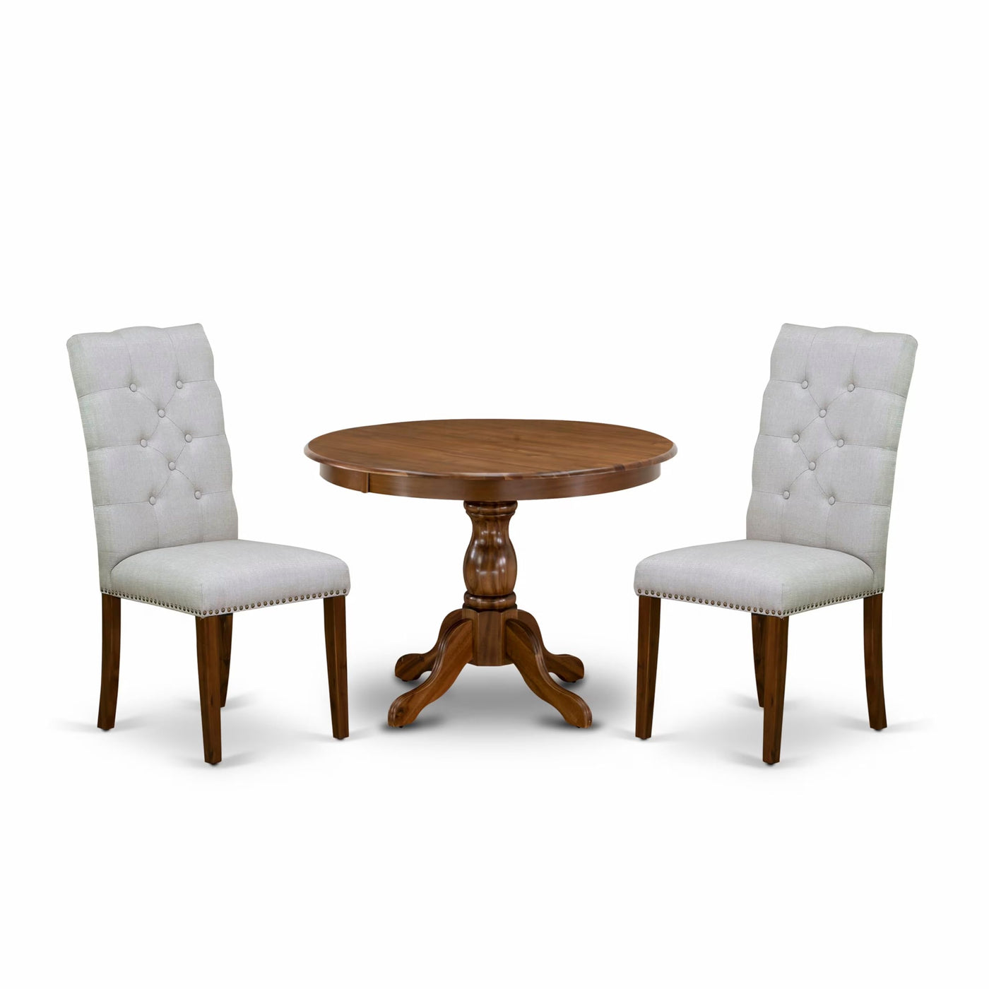 East West Furniture HBEL3-AWA-05 3 Piece Dining Table Set for Small Spaces Contains a Round Dining Room Table with Pedestal and 2 Grey Linen Fabric Parson Chairs, 42x42 Inch, Walnut