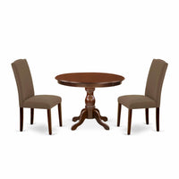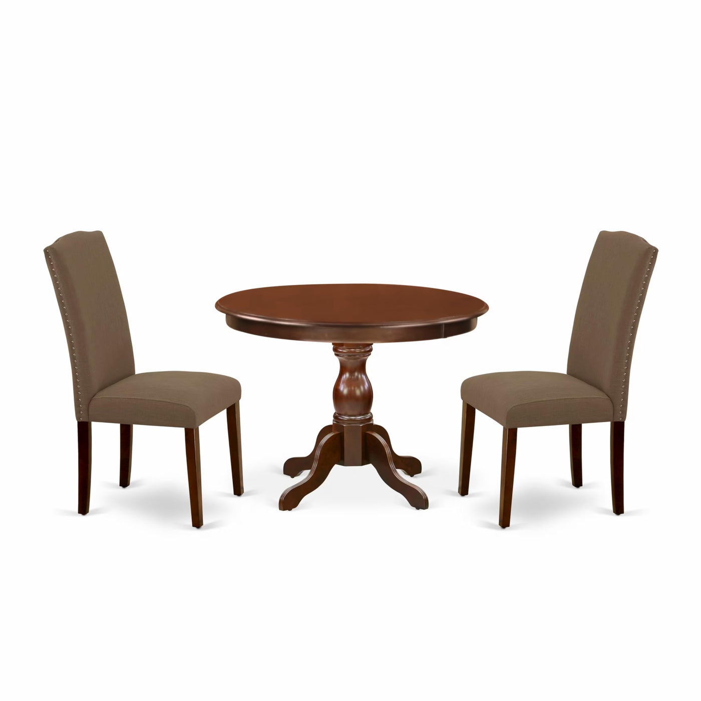 East West Furniture HBEN3-MAH-18 3 Piece Dining Table Set Contains a Round Dining Room Table with Pedestal and 2 Dark Coffee Linen Fabric Upholstered Chairs, 42x42 Inch, Mahogany