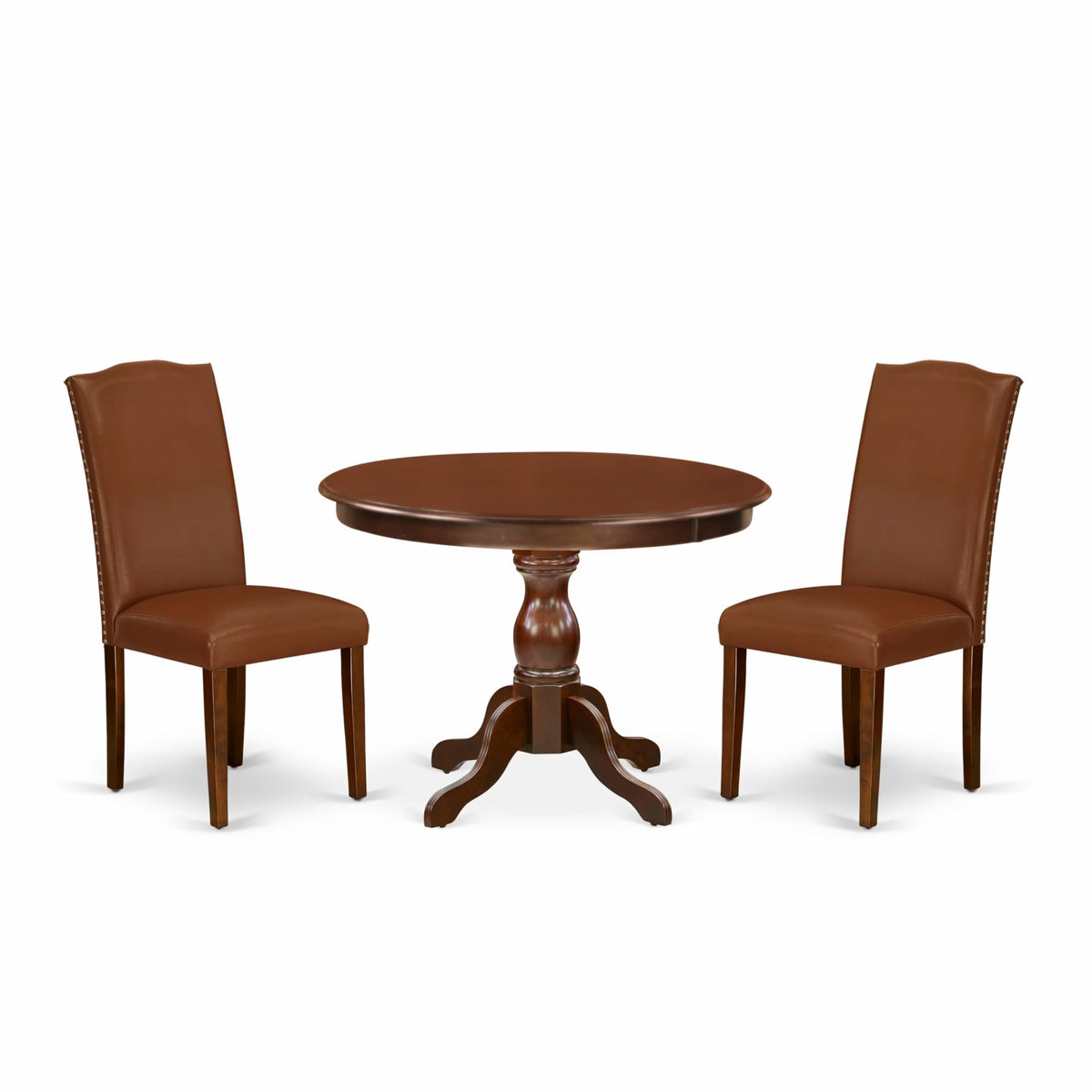 East West Furniture HBEN3-MAH-66 3 Piece Dining Room Table Set Contains a Round Kitchen Table with Pedestal and 2 Brown Faux Faux Leather Parsons Dining Chairs, 42x42 Inch, Mahogany