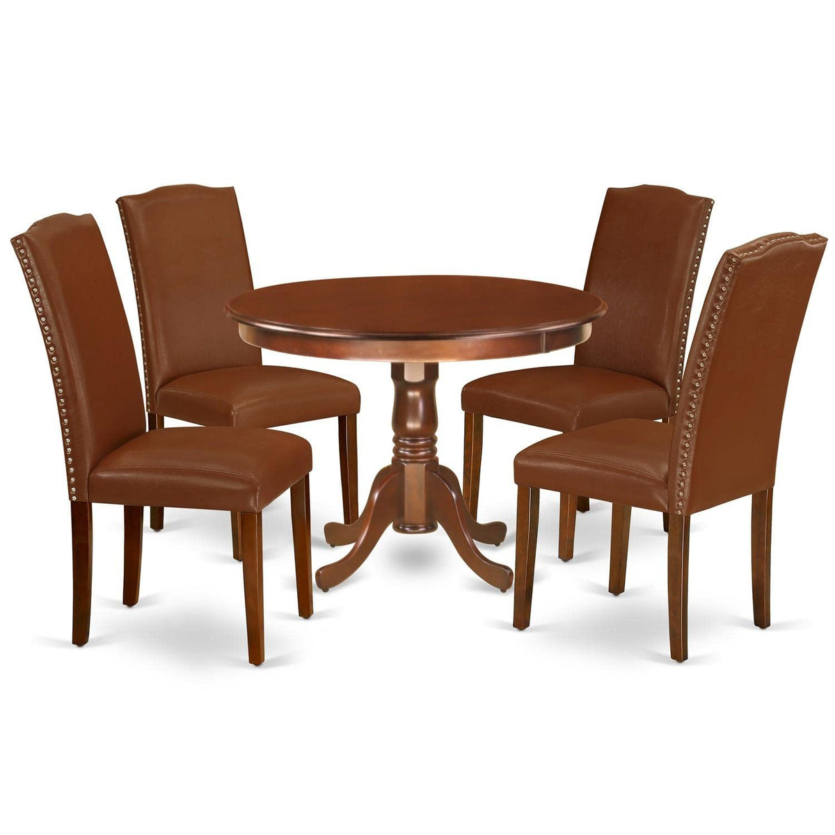 East West Furniture - Hlen5-Mah-66 5-Piece Dining Table Setexperience The Elegance And Comfort Of Our 5-Piece Dining Table Set, Featuring 4 Impressive Parson Chairs And An Exceptional Kitchen Table With Pedestal Legs. The Dining Set Features An Elegant Mahogany Finish That Complements Various Home Decor Styles. The Mahogany Finish Adds A Touch Of Shimmer And Creates Shadows On The Small Dining Table'S Pedestal, Enhancing Its Antique Charm With Distinct Contours And Ridges. The Traditional Parson Design Provides A Sense Of Familiarity, While The Pu Leather In Brown Color And Clean-Lined Structure Elevates The Chair With A Modern Flair. The Accompanying Parson Chair Is Simple Yet Charming, Perfect For Adding Ambiance And Style To Your Dining Room. It Offers A Contemporary Twist On A Classic Design, With Eye-Catching Features That Can Enliven Any Setting. The Frame Of The Kitchen Chairs Is Engineered For Optimal Comfort And Spinal Support, Reducing The Risk Of Back Pain. The Straight Legs Contribute To A Well-Worn Style, While The Arched Silhouette And Nailhead Trim Add Classic Character To The Overall Look. By Replacing Your Old Dining Set With This One, You Can Effortlessly Refresh Your Dining Space. This Dining Set Is Budget-Friendly, Durable, And Comfortable, Making It An Excellent Choice For Enjoyable Dining Experiences With Family Or Friends.Product Features: Material: Asian Hardwood Color: Mahogany Fabric: Pu Leather Cushion Material: Foam Fabric Color: Brown Table Dimensions: Length: 42; Width: 42; Height: 29.5. Chair Dimensions: Length: 24.5; Width: 19; Height: 40.5. Weight Capacity: 300 Lbs.Includes: 1 Round Table And 4 Parson Chairs.