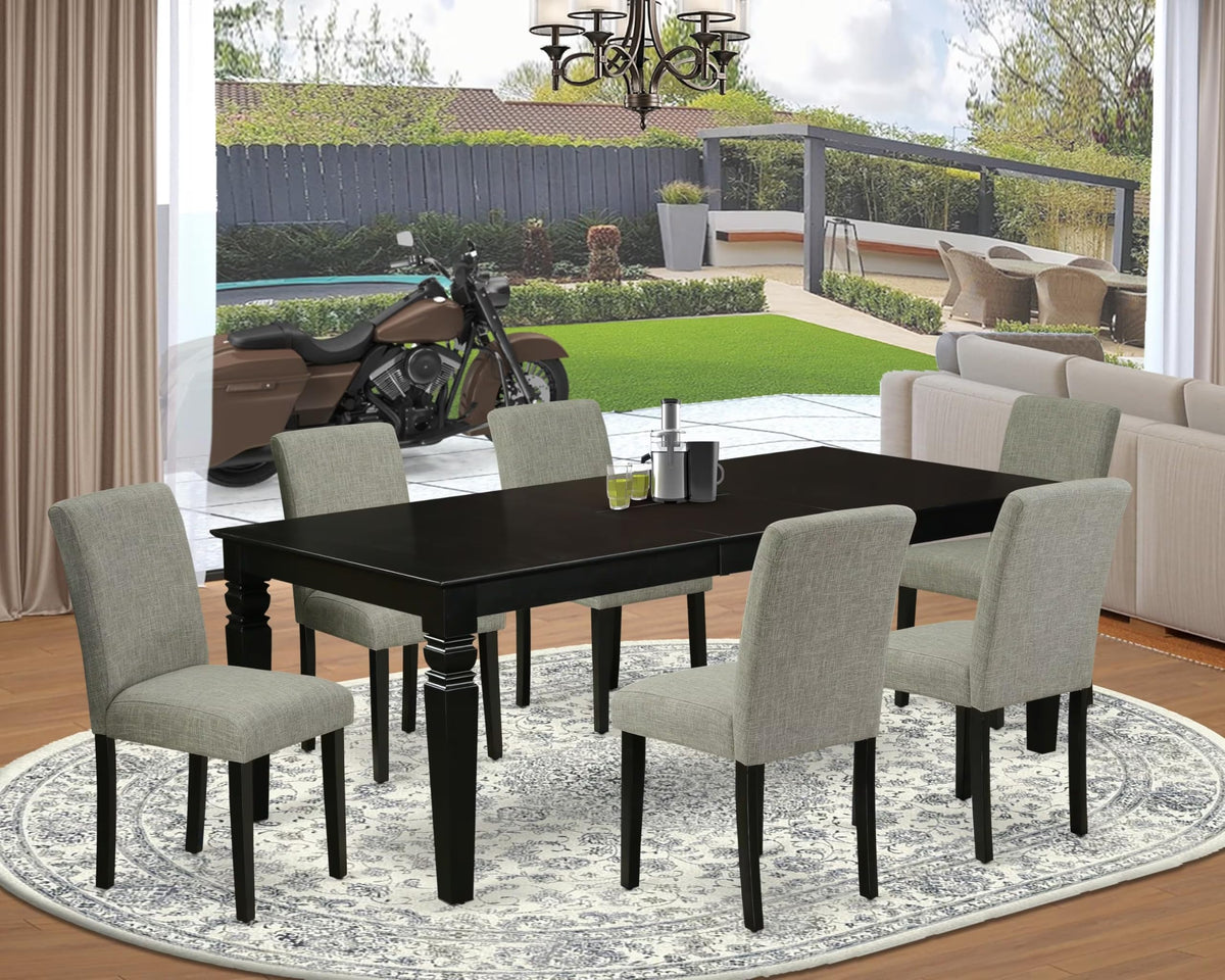 East West Furniture - Lgab7-Blk-06 - Dining Room Setintroduce Elegance And Charm To Your Dining Room With Our Highly Sought-After 7-Piece Dining Set. This Set Effortlessly Enhances The Visual Appeal Of Any Dining Area, Featuring A Splendid Rectangular Dining Table And Six Stunning Chairs. The Rectangular Kitchen Table Creates A Warm And Inviting Atmosphere For Family Gatherings. Its Comfortable And Elegant Black Color Imbues Any Dining Area With A Relaxed And Welcoming Ambiance. The Dining Table Showcases A Sleek Black Tabletop, Complemented By Legs Finished In Black. Our Dining Chairs Boast Seats Upholstered In Dark Shitake Linen Fabric, Supported By Four Black Wood Legs. This Dining Table Set Combines High-Quality Colors To Achieve An Elegant And Sophisticated Look For Any Home. This Wonderful Kitchen Table Is A Versatile Addition To Any Kitchen Space And Complements Various Dining Room Styles. The Simple Yet Charming Parson Chair Adds Ambiance And Style To Your Dining Room. With A Contemporary Twist On A Classic Design, This Eye-Catching Chair Breathes Life Into Any Setting. The Traditional Parson Style Infuses The Chair With A Touch Of Familiar Charm, While The Fabric-Shiitake Color And Clean-Lined Design Elevate It With A Modern Flair. Crafted From High-Quality Hardwood, The Frame Of The Kitchen Chairs Is Engineered To Provide Optimal Comfort And Support To Your Spine, Reducing The Chances Of Back Pain. This Budget-Friendly, Durable, And Comfortable Dining Set Is An Excellent Choice For Creating Memorable Dining Experiences With Your Family And Friends.Product Features: Material: Asian Hardwood Table Color: Black Fabric: Linen Fabric Cushion Material: Foam Fabric Color: Shitake Chair Leg Color: Black Chair Dimensions: Length: 22; Width: 17.20; Height: 35.20. Table Dimensions: Length: 84/66; Width: 42; Height: 30. Weight Capacity: 300 Lbs.Includes: A Rectangular Table And 6 Parson Chairs.Hardware Package And Instruction Manual Are Located In/Under The Seat.
