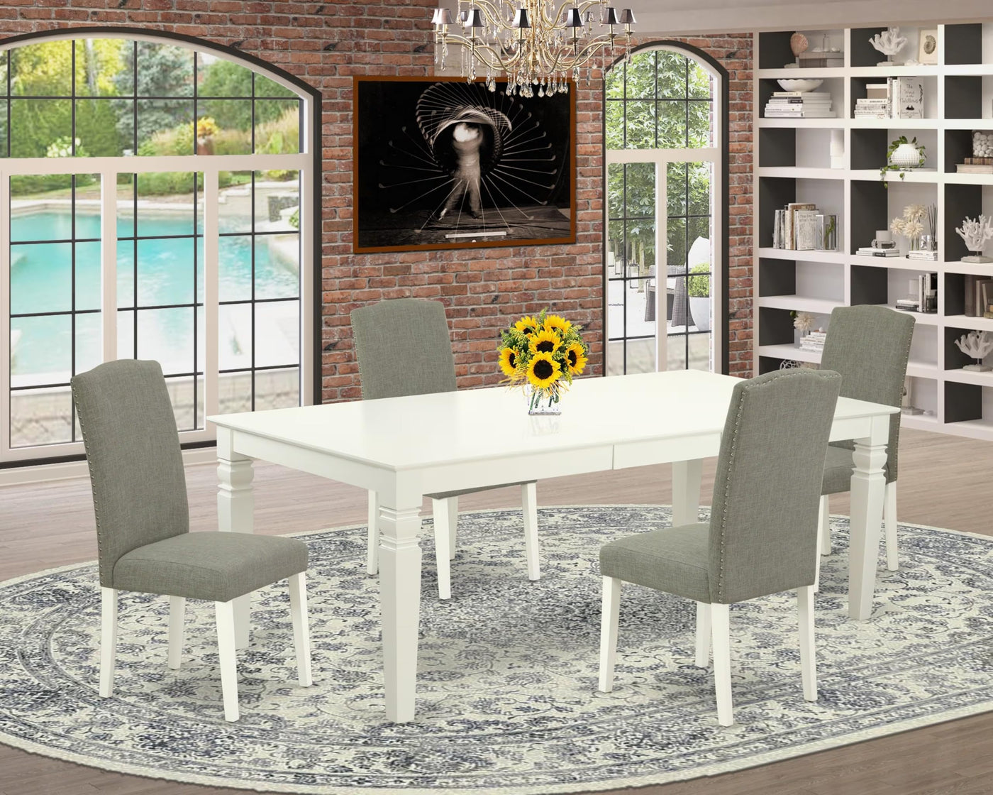 East West Furniture - Lgen5-Lwh-06 - 5-Piece Dining Table Setenhance The Sophistication Of Your Dining Area Using The 5-Piece Kitchen Table Set, Which Comprises 4 Exquisite Dining Room Chairs And A Stylish Dining Room Table. Our Dinner Table Showcases Notable Attributes Like A Linen White Tabletop And Legs, Creating A Cohesive And Fashionable Appearance. Similarly, Our Dining Room Chairs Feature Dark Shitake Linen Fabric Seats And Four Wooden Legs, Also Finished In The Elegant Linen White Hue. Meticulously Crafted By Skilled Artisans, Our Dining Room Set Is Made From Premium Rubber Wood, An Exceptional Asian Timber Recognized For Its Durability And Long Lifespan. This High-Quality Material Guarantees That Our Dining Room Set Not Only Possesses Elegance But Also Withstands The Test Of Time. Its Expert Craftsmanship Makes It A Perfect Addition To Any Dining Room, Lending A Touch Of Sophistication To Your Space. Elevating The Aesthetic Appeal Of Your Kitchen, Our Dining Chairs With Linen Fabric Seats Bring An Elegant Flair To The Area. Not Only Do They Exude A Sense Of Sophistication, But Their Spacious Seats Also Provide Exceptional Comfort For An Enjoyable Dining Experience. By Replacing Your Old Dining Set With This One, You Effortlessly Rejuvenate Your Dining Space. This Budget-Friendly Dining Set Not Only Offers Aesthetic Appeal But Also Ensures A Fantastic Dining Experience For You, Your Family, And Friends.Product Features: Material: Asian Hardwood Color: Linen White Fabric: Linen Fabric Cushion Material: Foam Fabric Color: Dark Shitake Table Dimensions: Length: 84/66; Width: 42; Height: 30. Chair Dimensions: Length: 24.5; Width: 19; Height: 40.5. Weight Capacity: 300 Lbs.Includes: A Rectangular Table And 4 Parson Chairshardware Package And Instruction Manual Is Located In/Under The Seat.