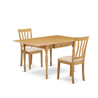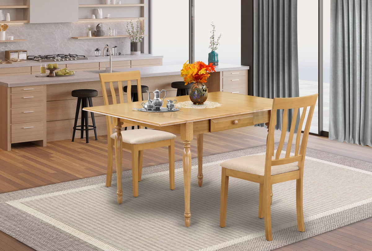 East West Furniture - Mzan3-Oak-C - Dining Room Setrevitalize Your Kitchen Space With This Versatile And Elegant Dining Table Set. This Exclusive Wood Dining Set Adds A Sophisticated Touch To Any Dining Area Or Residence, Suitable For Various Functions. The Comfortable 3-Piece Set Includes A Wood Table And 2 Dining Chairs. Crafted From High-Quality Asian Tropical Hardwood, Commonly Known As Rubberwood, The Oak-Finished Kitchen Table Features Smooth Edges And Stylish Round Legs. The Table Is Equipped With 2-Sided 9-Inch Drop-Down Leaves, Providing Extra Space For Food Trays And Drinks. Additionally, The Dining Table Includes 2 Drawers For Convenient Storage. The Assembly Process Is Simple, Ensuring Comfort And Long-Lasting Usage. The Stunning Dining Chairs Offer A Hardwood Top For A Modern And Exquisite Look. The Three Vertical Slats Add A Touch Of Class And Sophistication To Any Dining Area. Constructed From Solid Wood, The Chairs Are Stable And Durable. The Chair Frames Are Designed To Provide Excellent Spinal Support And Reduce The Risk Of Back Pain. The Dining Chairs Feature Linen Fabric Seats, Allowing For Customization And Perfect Design. The Coordinated Color Between The Dining Chairs And Table Creates An Appealing Contrast. With Its Contemporary Style, Affordability, Durability, And Comfort, This Dining Set Is A Great Choice For A Wonderful Dining Experience With Your Loved Ones.Product Features: Material: Asian Hardwood Color: Oak Seat Material: Linen Fabric Cushion Material: Foam Dimensions: Length: 54/36; Width: 36; Height: 30. Dimensions: Length: 20; Width: 18; Height: 38.5. Weight Capacity: 300 Lbsincluded In The Package: A Rectangular Dining Table And 2 Dining Chairs.
