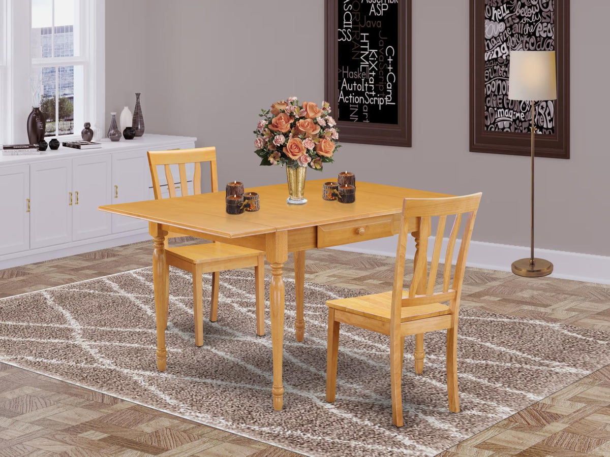 East West Furniture - Mzan3-Oak-W - Dining Room Setenhance Your Home With This Exclusive And Sophisticated Wood Dining Table Set. The Convenient Three-Piece Kitchen Set Includes A Small Dining Table And Two Dining Chairs. Crafted From Top-Rated Rubberwood, Known As Asian Hardwood, The Oak-Finished Rectangular Table Showcases Exceptional Quality. It Features Two 9-Inch Drop-Down Leaves, Providing Extra Space For Food Trays And Drinks. The Table Also Includes Two Drawers, Offering Additional Storage To Keep You Organized. Assembly Is Easy, Ensuring A Pleasurable Experience And Long-Lasting Use. The Stunning Modern Dining Chairs Complement The Table With Their Hardwood Tops, Adding An Exquisite And Contemporary Touch. With Solid Wood Seats, These Chairs Can Be Customized To Match Your Preferences And Desired Design. The Three Vertical Slats On Each Chair Bring A Touch Of Sophistication To Any Kitchen Area. Made From Solid Wood, The Dining Chairs Are Stable And Feature A Sturdy Finish. The Chair Frames Are Designed For Optimal Comfort And Spinal Support, Reducing The Risk Of Back Pain. With Its Standard Shape, Size, And Design, This Dining Set Significantly Enhances The Appeal Of Your Dining Area. This Contemporary, Affordable, Durable, And Comfortable Dining Set Is An Excellent Choice For Creating Enjoyable Dining Experiences With Your Family And Friends.Product Features: Material: Asian Hardwood Color: Oak Cushion Material: Foam Color: Oak Table Dimensions: Length: 54/36; Width: 36; Height: 30. Dimensions: Length: 20; Width: 18; Height: 38.5. Weight Capacity: 300 Lbsincludes In The Package: 1 Rectangular Table And 4 Cushion Seat Chairs.