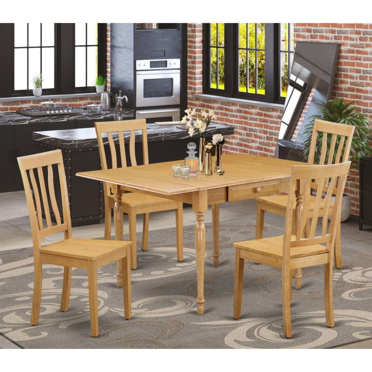 East West Furniture - Mzan5-Oak-W - Dining Room Setrevitalize Your Living Space With This Exclusive And Sophisticated Wood Dining Table Set. Elevate Any Dining Room Or Kitchen Area With Its Stylish Design, Perfect For Various Occasions. The Convenient 5-Piece Kitchen Set Includes A Small Dining Table And 4 Chairs. Crafted From Top-Quality Rubberwood, Also Known As Asian Hardwood, The Oak-Finished Rectangular Table Exudes Elegance. It Features 2-Sided 9-Inch Drop-Down Leaves, Providing Extra Space For Food Trays And Drinks. 2 Drawers Integrated Into The Table Offer Enhanced Storage In The Kitchen Or Dining Room, Promoting Organization. The Easy-To-Assemble Wood Table Ensures Both Pleasure And Long-Lasting Use. The Stunning Dining Chairs Showcase A Hardwood Top, Delivering An Exquisite And Modern Look. With Three Vertical Slats, They Add A Touch Of Class And Sophistication To Any Kitchen Area. Made Of Solid Wood, The Chairs Offer Stability And A Sturdy Finish, While Their Frames Prioritize Spinal Comfort, Reducing The Chances Of Back Pain. The Matching Color Of The Dining Chair Set With The Table Brings A Pleasing Contrast To The Kitchen Area. With Its Standard Shape, Size, And Design, This Contemporary, Affordable, Durable, And Comfortable Dining Set Is An Ideal Choice For An Exceptional Dining Experience With Family Or Friends.Product Features: Material: Asian Hardwood Color: Oak Table Dimensions: Length: 54/36; Width: 36; Height: 30. Dimensions: Length: 20; Width: 18; Height: 38.5. Weight Capacity: 300 Lbsincludes In The Package: 1 Rectangular Table And 4 Cushion Seat Chairs.