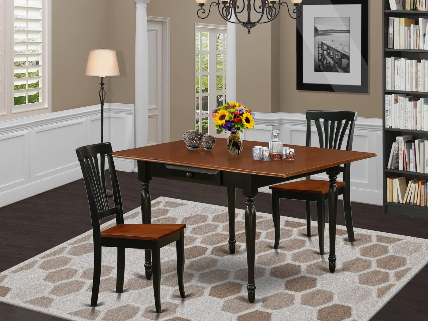 East West Furniture - Mzav3-Bch-W - Dining Room Setelevate Your Home With This Distinctive And Stylish Kitchen Set, Perfect For Small Spaces. The Set Includes A Charming Kitchen Table And Two Comfortable Dining Chairs. Crafted From High-Quality Asian Tropical Hardwood, Known As Rubberwood, The Rectangular Table Features A Sleek Black And Cherry Finish, Smooth Edges, And Round Legs For A Modern Touch. With 2-Sided 9-Inch Drop-Down Leaves, The Table Provides Extra Space For Food Trays And Drinks. The Table Also Offers 2 Drawers For Convenient Storage. The Wooden Chairs, Made From Hardwood, Provide Fashionable And Comfortable Seating, Enhancing Your Dining Experience. They Add Elegance And Class To Any Setting. The Chairs Are Designed To Offer Excellent Spinal Support, Reducing The Chances Of Back Pain. The Matching Color Scheme Of The Chairs And Table Creates A Pleasing Contrast In The Kitchen Area. The Standard Shape, Size, And Design Make The Dining Area Significantly Attractive. This Contemporary And Durable Dining Set Is Perfect For Enjoying Great Meals With Family And Friends.Product Features: Material: Asian Hardwood Color: Black And Cherry Table Dimensions: Length: 54/36; Width: 36; Height: 30. Dimensions: Length: 22; Width: 18; Height: 36. Weight Capacity: 300 Lbsincludes In The Package: 1 Rectangular Table And 4 Cushion Seat Chairs.