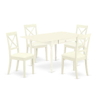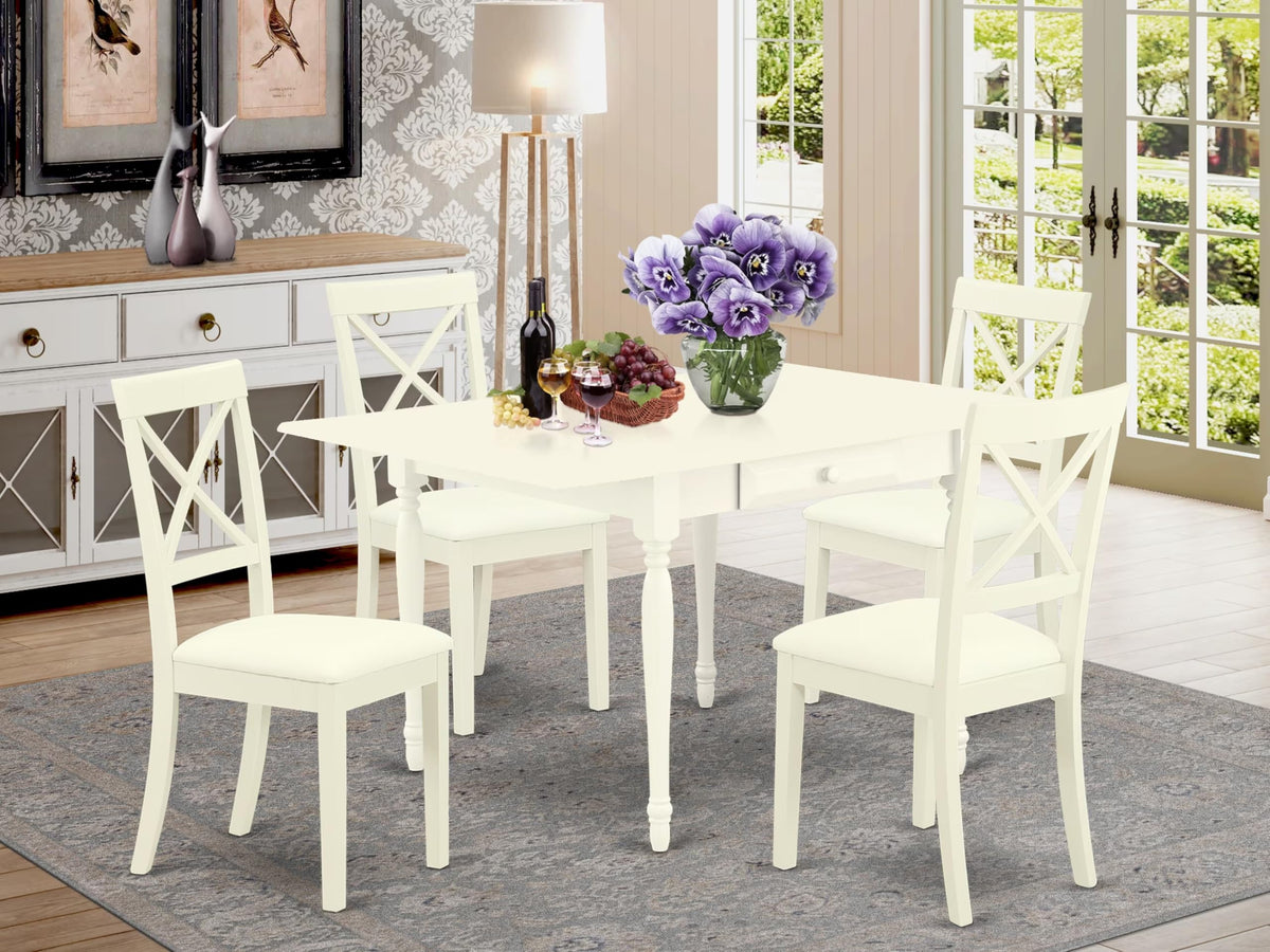 East West Furniture - Mzbo5-Lwh-Lc - Dining Table Setelevate Your Kitchen Area With This Stylish Kitchen Set, Creating An Amazing And Shiny Appearance. These Exquisite Kitchen Table Sets Feature An Elegant Design That Enriches Any Kitchen Or Dining Space For Gatherings. The Comfortable 5-Piece Dining Table Set Includes A Small Table And 4 Chairs With Faux Leather Seats. Crafted From High-Quality Asian Hardwood, The Rectangular Table Finished In Linen White Is Made Of Durable Rubber Wood. The Small Kitchen Table Features 2-Sided 9-Inch Drop-Down Leaves, Providing Additional Space For Food Trays And Drinks. With 2 Drawers, The Dining Table Amplifies Storage, Promoting Organization In Your Kitchen Or Dining Room. Easy To Assemble, The Small Kitchen Table Ensures Pleasure And Long-Lasting Use. The Slender X-Back Wood Dining Chairs Offer Trendy And Comfortable Seating, With Faux Leather Seats That Match Your Preference And Ideal Motif. Built With Hardwood, The Dining Chairs Are Stable And Durable, Adding Elegance And Class To Any Space. Engineered For Comfort, The Chairs Prioritize Spinal Support, Reducing The Chances Of Back Pain. The Durable Faux Leather Seat Is Moisture-Resistant And Easy To Clean, While The Matching Color Of The Set Of 4 Chairs With The Table Creates A Captivating Contrast In Your Kitchen Area. This Contemporary, Budget-Friendly, Durable, And Comfortable Dining Room Table Set Is An Excellent Choice For A Great Dining Experience With Family And Friends.Product Features: Material: Asian Hardwood Color: Linen White Upholstered: Faux Leather Cushion Material: Foam Table Dimensions: Length: 54/36; Width: 36; Height: 30. Dimensions: Length: 21; Width: 18; Height: 38. Weight Capacity: 300 Lbsincludes In The Package: 1 Rectangular Table And 4 Parson Chairs.