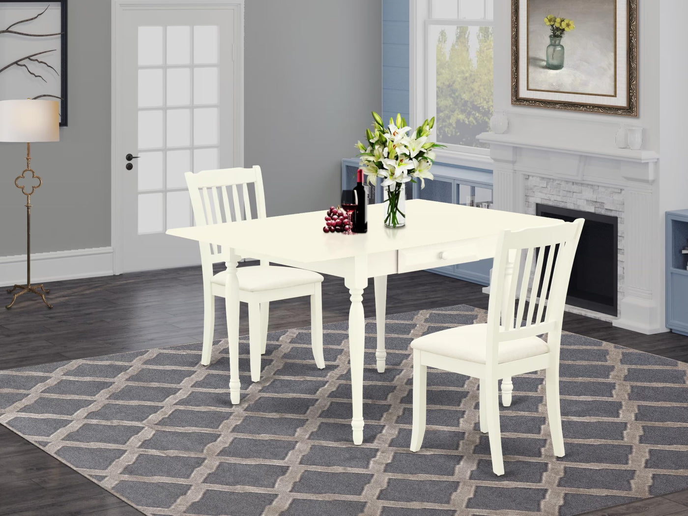 East West Furniture - Mzda3-Lwh-C - Dining Room Setexperience The Convenience And Style Of This Practical 3-Piece Kitchen Set, Featuring A Rectangle Table And 2 Dining Chairs With Linen Fabric Upholstery. Crafted From Asian Tropical Hardwood, Recognized As Rubberwood, The Dining Room Table Is Finished In A Charming Linen White, Accentuated By Its Smooth Edges And Elegantly Designed Rounded Legs, Creating A Fancy And Stylish Look. The Eye-Catching Danbury Cushioned Upholstery Dining Chairs, Finished In Luxurious Linen White, Bring A Modern And Sophisticated Touch To Your Kitchen Space. These Dining Chairs Are Thoughtfully Designed With Linen Fabric Upholstery Cushioned Seats, Tailored To Suit Personal Preferences And Boasting A Perfect Design. The Rectangular Table Cleverly Incorporates Two 9-Inch Drop-Down Leaves, Providing Additional Space For Food Trays And Drinks. Enhancing Its Functionality, The Table Is Equipped With Two Drawers, Offering Extra Storage To Keep Your Dining Area Organized. Assembly Of The Rectangular Table Is A Breeze, Ensuring Both Pleasure And Long-Lasting Use. The Stylish Dining Room Chair Features Curved Front Legs, While The Seven Vertical Slats Add A Touch Of Class And Sophistication To Any Dining Area. Crafted From Hardwood, The Dining Room Chairs Set Provides Stability And A Sturdy Finish, Adding Elegance And Class To Any Space They Adorn. The Frame Of The Dining Chairs Is Engineered To Offer Exceptional Comfort, Reducing The Chances Of Back Pain. Elevate Your Dining Experience With This Remarkable 3-Piece Dining Set, Combining Practicality, Style, And Comfort In One Exquisite Package.Product Features: Material: Asian Hardwood Color: Linen White Fabric: Linen Fabric Cushion Material: Foam Table Dimensions: Length: 54/36; Width: 36; Height: 30. Chair Dimensions: Length: 22; Width: 18; Height: 38. Weight Capacity: 300 Lbsincluded In The Package: 1 Rectangular Table And 2 Wooden Chairs.