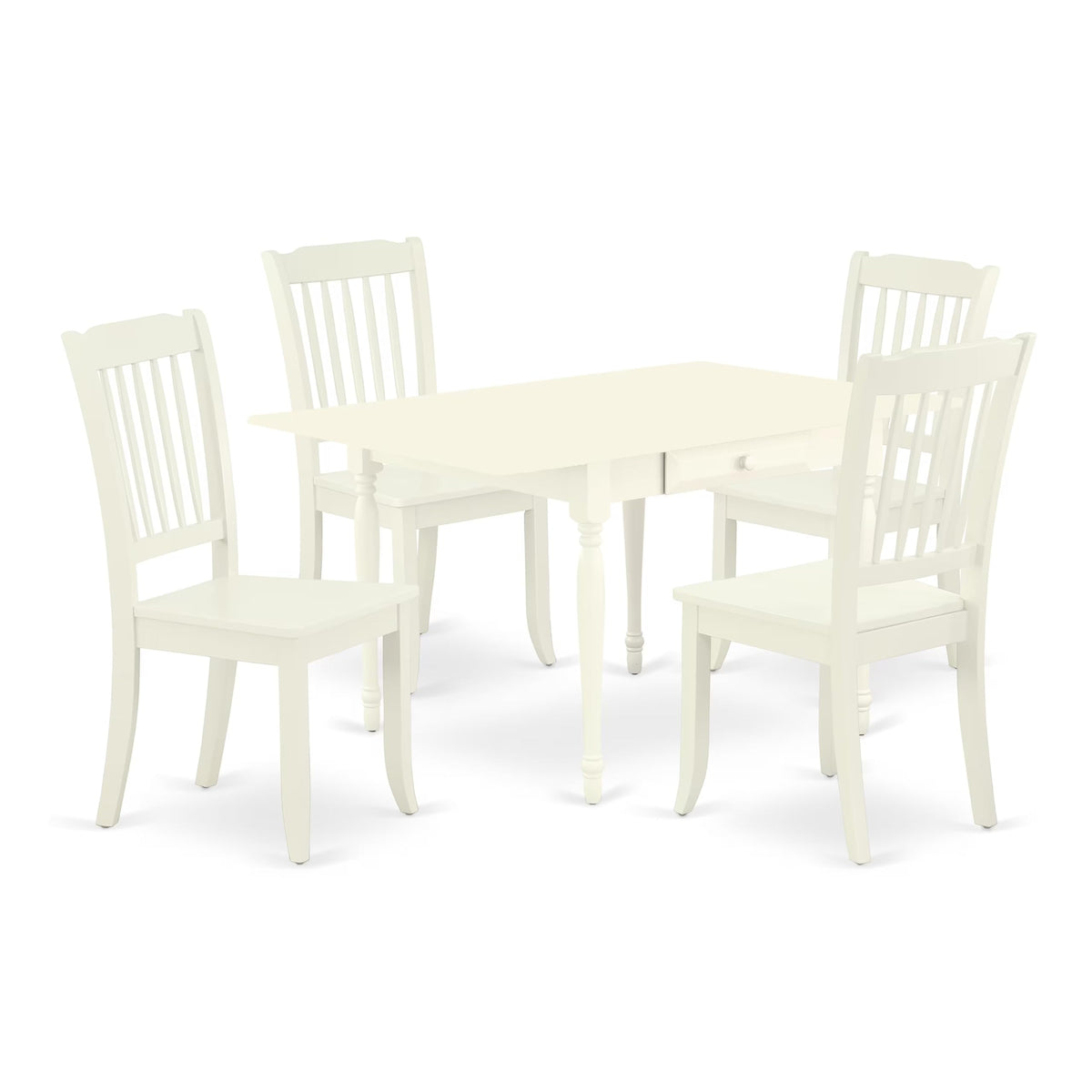 East West Furniture - Mzda5-Lwh-W - Dinning Room Table Setexperience The Practicality And Elegance Of This Modern 5-Piece Dining Table Set, Featuring A Dining Room Table And 4 Dining Chairs. The Rectangular-Shaped Hardwood Table, Finished In A Refreshing Linen White, Is Meticulously Crafted From Premium Rubberwood, Known As Asian Hardwood. The Eye-Catching Danbury Dining Chair, Finished In A Luxurious Linen White, Brings A Modern Look To Your Kitchen Space. This Dining Room Chair Features A Solid Wood Seat, Accommodating Personal Preferences And Offering Perfect Design. The Small Dining Table Is Designed With Two 9-Inch Drop-Down Leaves, Providing Additional Space For Food Trays And Drinks. Enhancing Its Functionality, The Table Is Equipped With Two Drawers, Amplifying Storage Options And Promoting Organization In Your Kitchen Or Dining Room. The Assembly Process Of The Small Dining Table Is Effortless, Ensuring Both Pleasure And Long-Lasting Use. Crafted From Hardwood, The Dining Room Chair Provides Stability And A Sturdy Finish, Exuding Elegance And Class Wherever They Are Placed. The Frame Of The Wooden Dining Chairs Is Engineered To Offer Exceptional Comfort, Reducing The Chances Of Back Pain.Product Features: Material: Asian Hardwood Color: Linen White Table Dimensions: Length: 54/36; Width: 36; Height: 30. Dimensions: Length: 22; Width: 18; Height: 38. Weight Capacity: 300 Lbsincludes In The Package: 1 Dining Room Table And 4 Parson Chairs.