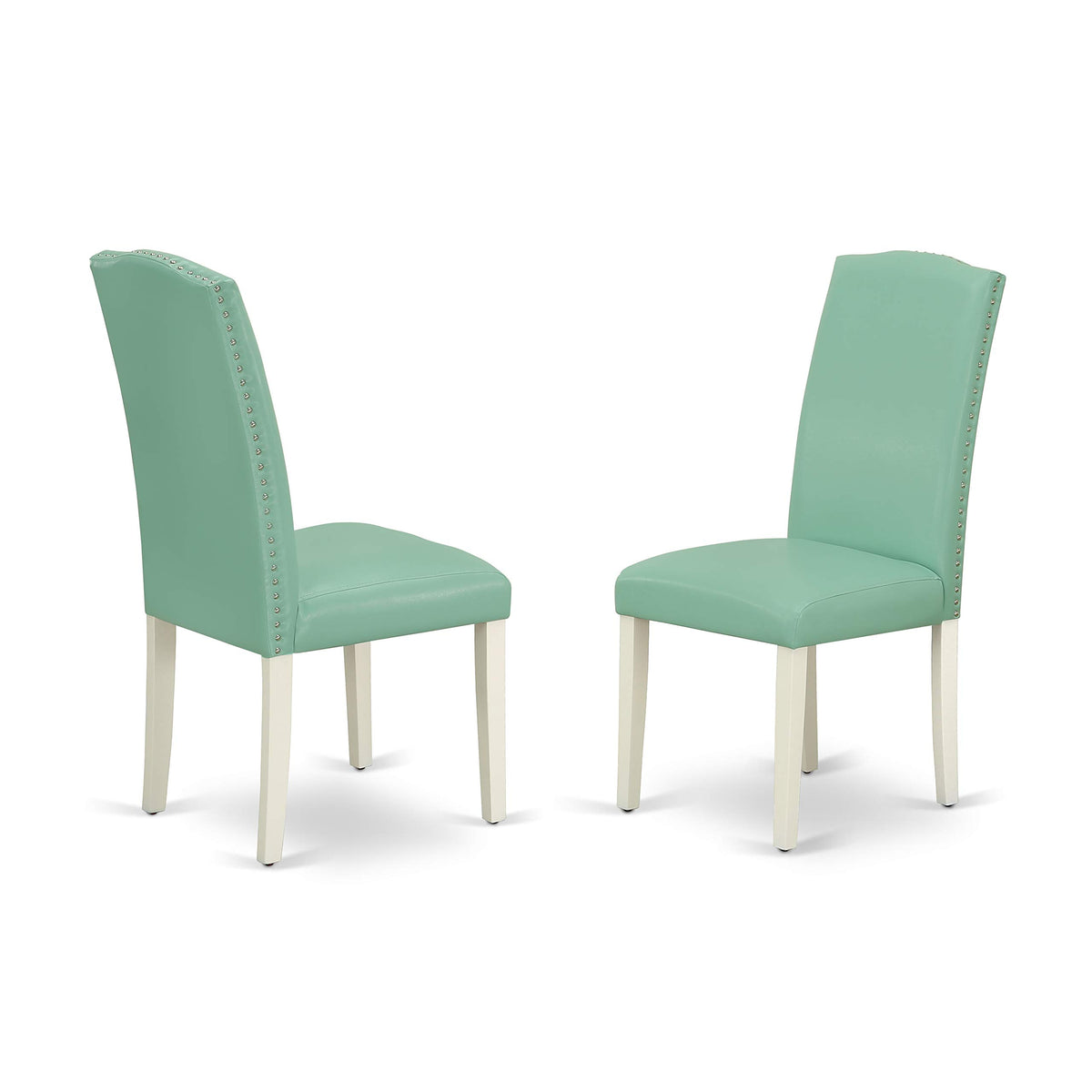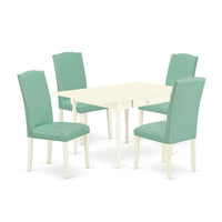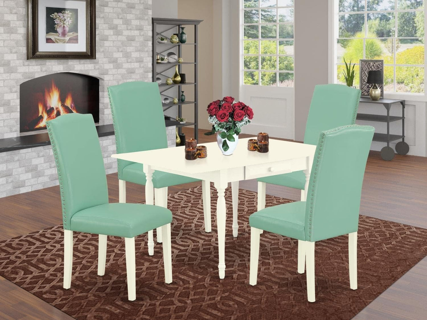 East West Furniture - Mzen5-Lwh-57 - Dining Kitchen Table Setexperience The Cozy Elegance Of Our 5-Piece Kitchen Table Set, Featuring A Dining Table And 4 Parson Chairs. The Traditional Parson Style Brings A Touch Of Familiar Charm, While The Pond-Colored Pu Leather Upholstery And Clean-Lined Design Elevate The Chair With A Modern Flair. The Rectangle-Shaped Solid Wood Table, Finished In A Delightful Linen White, Is Meticulously Crafted From Prime Quality Rubberwood, Also Known As Asian Hardwood. This Ensures Exceptional Durability And A Touch Of Sophistication. The Wood Dining Table Seamlessly Integrates Two 9-Inch Drop-Down Leaves, Providing Ample Space For Additional Food Trays And Drinks. To Enhance Functionality, The Table Features Two Drawers, Amplifying Storage Options In Your Kitchen Or Dining Room, Promoting Organization And Efficiency. Assembly Of The Wood Dining Table Is A Breeze, Ensuring Both Comfort And Long-Lasting Use. The Upholstered Dining Chairs, Simple Yet Charming, Add Ambiance And Style To Your Dining Room. With A Contemporary Twist On A Classic Design, This Eye-Catching Parson Dining Chair Breathes New Life Into Any Space.Product Features: Material: Asian Hardwood Color: Linen White Fabric: Pu Leather Cushion Material: Foam Fabric Color: Pond Dimensions: Length: 54/36; Width: 36; Height: 30. Dimensions: Length: 24.5; Width: 19; Height: 40.5. Weight Capacity: 300 Lbsincluded On The Package: 1 Dining Room Table And 4 Parson Chairs.