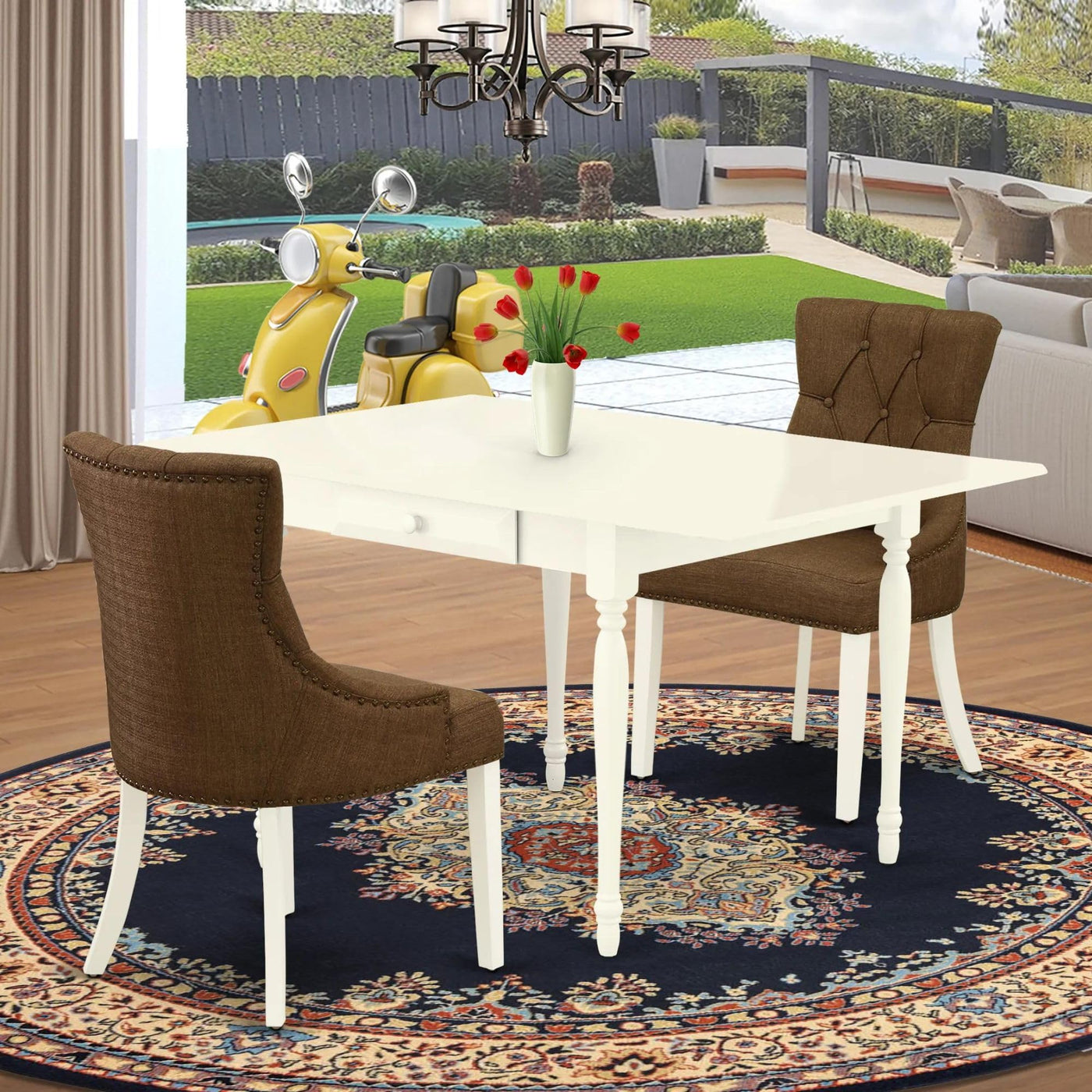 East West Furniture - Mzfr3-Lwh-18 - Dining Room Setexperience The Perfect Dining Solution With Our Exceptional 3-Piece Wood Dining Table Set, Featuring A Small Dining Table And 2 Parson Chairs. Crafted From Asian Tropical Hardwood, Commonly Known As Rubberwood, This Set Combines Durability And Elegance. The Drop Leaf Table, Finished In A Charming Linen White, Boasts Smooth Edges And Gracefully Fashioned Round Legs, Exuding An Air Of Sophistication. The Conventional Parson Design Adds A Touch Of Familiarity, While The Dark Coffee-Colored Linen Fabric And Clean-Lined Design Elevate The Chairs With A Modern Flair. Designed With Convenience In Mind, The Dining Table Incorporates Two 9-Inch Drop-Down Leaves, Providing Additional Space For Food Trays And Drinks. The Table Also Features Two Drawers, Offering Extra Storage To Keep You Organized And Clutter-Free. Assembly Is A Breeze, Requiring No Extra Tools, Ensuring A Hassle-Free Setup Process. Enhance The Beauty Of Your Dining Room With Our Regal And Affordable Parson Chairs. These Chairs Feature An Upholstered Design With A Beautiful Stitched Exterior. With A Standard Back, Linen Fabric Upholstery, Button-Tufted High-Density Foam Padding, And Solid Hardwood Frame Construction, They Offer Both Comfort And Durability.Product Features: Material: Asian Hardwood Color: Linen White Fabric: Linen Fabric Cushion Material: Foam Fabric Color: Dark Coffee Table Dimensions: Length: 54/36; Width: 36; Height: 30. Chair Dimensions: Length: 22.5; Width: 22.2; Height: 36.2. Weight Capacity: 300 Lbsincludes In The Package: 1 Rectangular Table And 2 Parson Chairs.