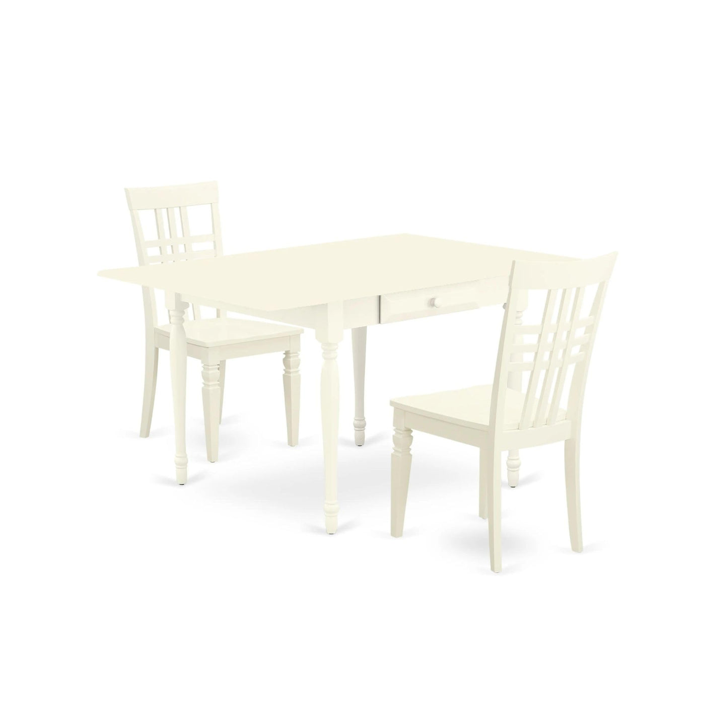 East West Furniture - Mzlg3-Lwh-W - 3 Pieces Dining Room Table Setelevate Your Dining Area With This Extraordinary Contemporary Dining Table Set, Which Will Effortlessly Enhance The Overall Look Of Your Space. This 3-Piece Kitchen Set Includes 2 Dining Room Chairs And A Durable Breakfast Table. The Chairs Feature A Wooden Panel Back For Optimal Comfort, Complemented By A Smooth And Cozy Real Wood Seat That Offers A Delightful Seating Experience. The Kitchen Table Set Showcases An Impressive Aesthetic With Its Linen White Finish On Both The Structure And Seat. Crafted From High-Quality Wood, This Dining Table Set Boasts A Seamless Design That Adds To The Overall Appeal Of Your Dining Room. Manufactured Using Top-Notch Asian Wood, Specifically Rubberwood, This Set Is Exceptionally Sturdy And Reliable. The Impeccable Finish Of The Dining Table And Wooden Chairs Reflects The Skilled Craftsmanship Of Experienced Carpenters. Assembling This Dining Table Set Is A Breeze, Allowing You To Save Energy And Easily Relocate It If Necessary. Within Minutes And With Minimal Tools, You Can Effortlessly Put Together The Wood Chairs And Kitchen Table In The Comfort Of Your Own Home. Additionally, Both The Dining Chairs And Breakfast Table Are Easy To Clean, Ensuring Good Hygiene In Your Home Is Easily Maintained.Product Features: Material: Solid Wood Color: Linen White Kitchen Table Dimensions: Length: 54/36; Width: 36; Height: 30. Kitchen Chairs Dimensions: Length: 23; Width: 18; Height: 39. Table'S Extra Features: Two 9-Inch Drop Down Leaves And 2 Drawerspackage Includes: 1 Modern Dining Table 2 Kitchen Dining Chairs.