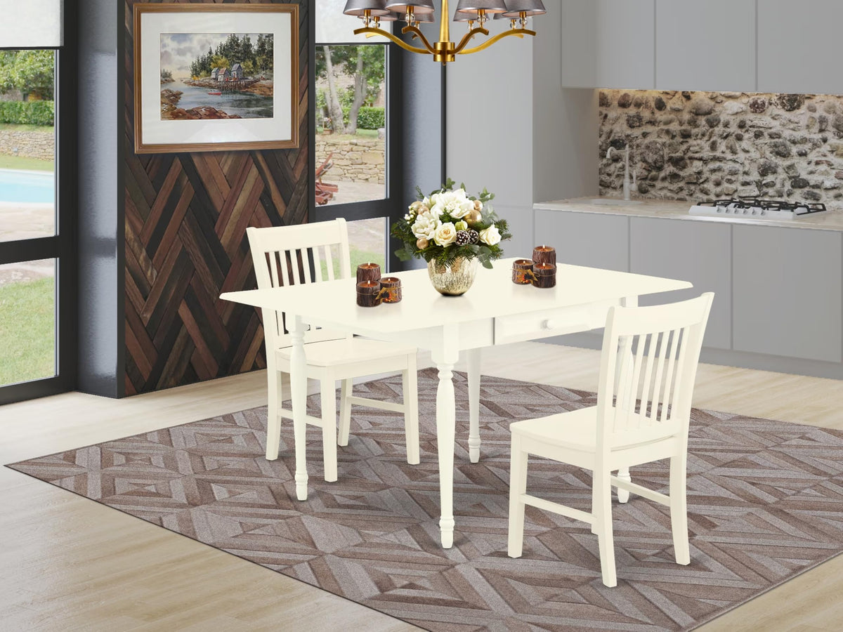 East West Furniture - Mzno3-Lwh-W - 3 Pieces Dining Room Table Setelevate Your Dining Area To New Levels Of Beauty With This Extraordinary Kitchen Table Set. Crafted From Beautiful Wood, This Kitchen Table Set Exudes Elegance And Sophistication. Included In This 3-Piece Dining Table Set Are 2 Luxurious Dining Room Chairs And A Sturdy, Heavy-Duty Dining Table. The Dining Chairs Boast A Comfortable Solid Wood Slat Back, Ensuring Constant Comfort For The User. With A Smooth And Inviting Hardwood Seat, These Chairs Provide An Exceptional Sitting Experience. The Linen White Finish On The Body And Seat Of The Chairs Adds A Touch Of Grandeur To Your Dining Area. Built From High-Quality Asian Hardwood, Commonly Known As Rubberwood, This Kitchen Set Is Exceptionally Durable And Reliable. The Mid-Century Design Of The Table And Chairs Showcases The Skillful Craftsmanship Of Experienced Carpenters, Resulting In A High-Quality Finish. Assembly Is A Breeze, Saving You Time And Allowing You To Effortlessly Move The Set To Different Locations. Within Minutes And With Minimal Tools, You Can Assemble The Wood Chairs And Modern Dining Table In The Comfort Of Your Home. Additionally, These Kitchen Chairs And Dining Room Table Are Easy To Clean.Product Features: Material: Hard Wood Color: Linen White Wood Table Dimensions: Length: 54/36; Width: 36; Height: 30. Wooden Dining Chairs Dimensions: Length: 19; Width: 18; Height: 35. Table'S Extra Features: Two 9-Inch Drop Down Leaves And 2 Drawerspackage Includes: 1 Rectangle Dining Table And 2 Kitchen Dining Chairs