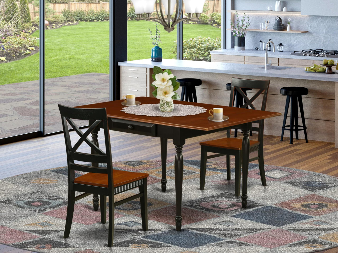 East West Furniture - Mzqu3-Bch-W - 3 Pieces Dining Kitchen Table Setenhance The Elegance Of Your Dining Room With This Exquisite Kitchen Table Set. The Set Comprises A Stylish And Seamlessly Designed Breakfast Table, Accompanied By 2 Attractive Modern Dining Chairs. These 3 Pieces Come Together To Create A Stunning Addition To Your Dining Area. The Dining Chairs Feature A Comfortable Solid Wood X-Back Design, Ensuring Continuous Comfort For The User. With Their Smooth And Cozy Real Wood Seats, These Chairs Provide A Fantastic Sitting Experience. The Combination Of A Black Finish Structure And Cherry Seats Adds A Remarkable Touch To The Overall Appearance Of The Dining Set. Crafted From High-Quality Asian Rubberwood, Also Known As Solid Wood, This Kitchen Table Set Is Exceptionally Sturdy And Reliable. Expert Carpenters Have Meticulously Constructed The Table And Chairs, Ensuring A Premium Finish. Assembling This Dining Room Table Set Is A Breeze, Saving You Time And Effort. With Just A Few Simple Tools, You Can Easily Assemble The Wooden Chairs And Dining Table Within Minutes. Additionally, Cleaning The Set Is Hassle-Free, As It Can Be Treated Like Any Other Piece Of Furniture In Your Home.Product Features: Material: Solid Wood Seat Color: Black And Cherry Table Dimensions: Length: 54/36; Width: 36; Height: 30. Dining Chairs Dimensions: Length: 22; Width: 18; Height: 40. Table'S Extra Features: Two 9-Inch Drop Down Leaves And 2 Drawerspackage Includes: 1 Dining Room Table, 2 Dining Chairs