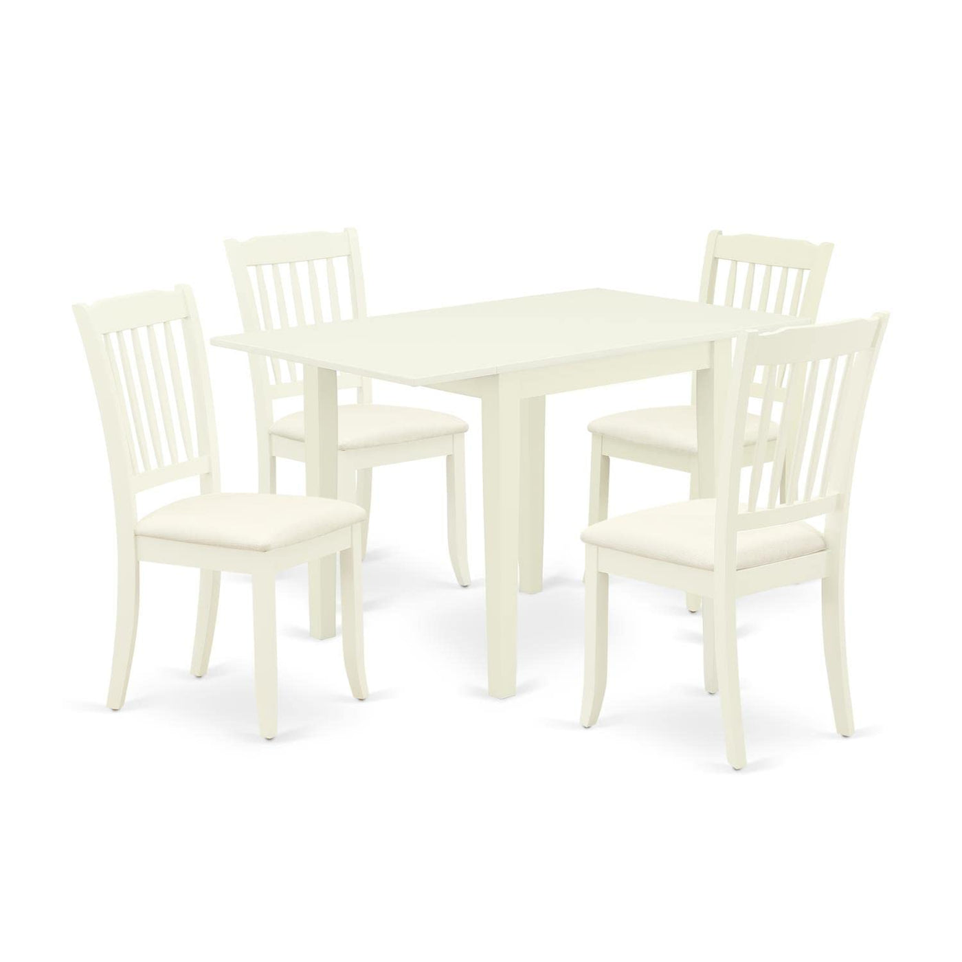 East West Furniture - Ndda5-Lwh-C- 5-Piece Of Kitchen Dining Table Setelevate The Style Of Your Dining Room With Our Attractive Modern Dining Table Set, Featuring 5 Pieces. This Set Includes 4 Wooden Dining Room Chairs And A Stunning Wooden Dining Room Table. The Exclusive Slatted Back Design Of The Wood Dining Chairs Adds To The Elegance Of Any Dining Area And Provides Excellent Support For Your Back. Crafted From Prime-Quality Asian Wood (Rubber Wood), Both The Body Of These Contemporary Kitchen Dining Chairs And The 2-Drop Leaf Wood Table Ensure Exceptional Robustness And Stability. The Comfortable Seat Of These Fantastic Wood Dining Chairs Is Made From Superior-Quality Linen White Fabric, Offering Both A Visually Appealing Look And A Comfortable Sitting Experience. The Amazing Designs Of This Special Dining Room Table Complement Various Home Decorations, While The Soft Cushion Upholstered In Linen Fabric Seat And The Solid Wood Slatted Back Of These Kitchen Chairs Ensure Optimal Comfort For Users. With A Durable Real Wood Structure, Along With The Comfortable Linen Fabric Seat And Wood-Slatted Back, Combined With The Dependable Wood Dining Table, This Set Exudes A Stylish Appearance In Your Dining Room. It Provides Excellent Steadiness To These Impressive Dining Chairs And Modern Dining Table, Ensuring Comfortable Support For Your Back. Thanks To Its Perfectly Sized Measurements, This Dining Room Table Set Is Easy To Carry, Clean, Assemble, And Adjust To Different Locations As Needed.Product Features: Frame Material: Asian Wood Fabric: Linen Fabric Cushion Material: Foam Fabric Color: Linen White Table And Chair’S Frame Color: Linen White Wood Chairs Dimensions: Length: 22; Width: 18; Height: 38. Wood Table Dimensions: Length: 48/30; Width: 30; Height: 30.Package Includes: 4 Kitchen Dining Chairs And 1 Dining Room Table