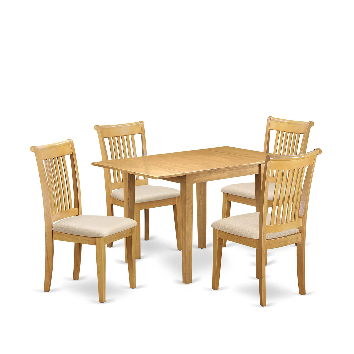 East West Furniture - Ndpo5-Oak-C- Dining Room Table Settransform Your Dining Area Into A More Sophisticated Space With This Charming And Sleek Dining Table Set. Designed To Bring A Modern Flair, This Kitchen Set Consists Of A 5-Piece Ensemble, Including A Rectangular Dinner Table And 4 Exquisite Dining Room Chairs. The Chairs Are Carefully Crafted With A Sturdy Slat Back, Guaranteeing A Comfortable Seating Experience. Both The Breakfast Table And Dining Chairs Are Beautifully Finished In Oak, Adding An Element Of Elegance To Your Decor. Made From High-Quality Hardwood, These Stylish Dining Chairs Feature Linen Fabric Seats With An Impressive Finish. This Finish Not Only Showcases The Natural Beauty Of The Wood But Also Effortlessly Complements Any Existing Color Schemes. Constructed From Durable Asian Hardwood, This Solid Modern Dining Set Ensures Stability And Durability. Importantly, Every Component Of This Modern Dining Table Set, From The Tabletop To The Table Legs, Is Crafted Entirely From 100% Hardwood, Without Any Compromise On Heat-Treated Pressured Wood Like Mdf, Particleboard, Or Veneer Top. Assembling This Attractive Dining Room Set Is A Breeze. Each Part Is Clearly Labeled, And The User-Friendly Instructions Make It Easy To Have The Set Ready In No Time At All.Product Features: Frame Material: Asian Hardwood Color: Oak Chair Back: Slat Chair Dimension: Length: 22; Width: 17; Height: 38. Table Dimension Length: 48/30; Width: 30; Height: 30.