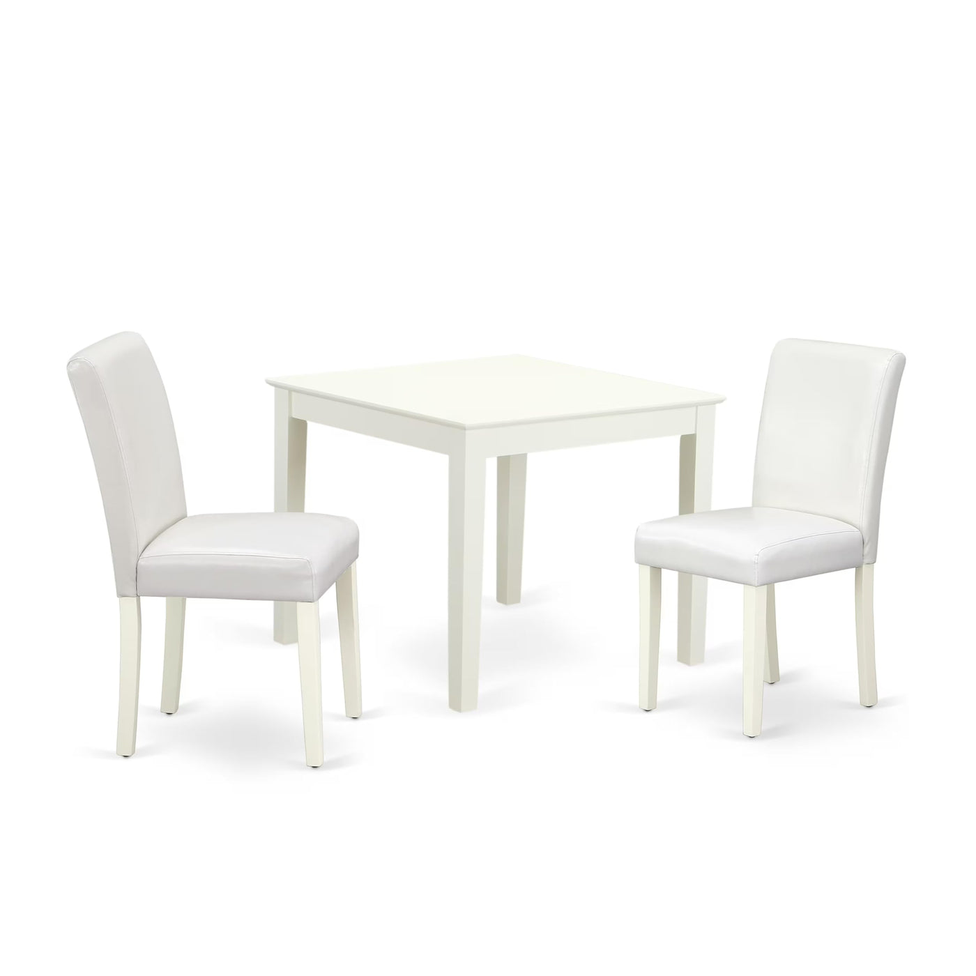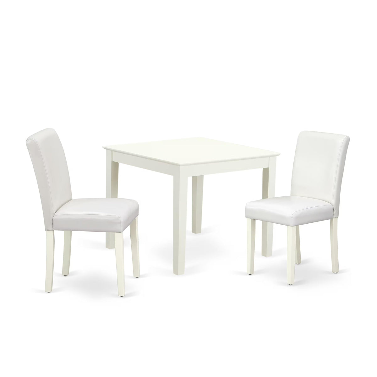 East West Furniture - Oxab3-Lwh-64 - Kitchen Dining Table Setintroducing Our Exquisite 3-Piece Mid-Century Kitchen Table Set That Will Elevate The Elegance Of Your Dining Room Or Kitchen. The Set Includes A Chic Breakfast Table And Two Matching Dining Room Chairs, Exuding A Contemporary And Sophisticated Aura. The Square Dining Table Showcases Clean Lines And A Cutting-Edge Design. Its Beveled Tabletop In A Linen White Finish Creates A Captivating Interplay Of Glimmer And Shadows On Its Legs, Boasting Charming Contours And Ridges That Impart An Antique Allure. Crafted Entirely From 100% Solid Wood, This Dining Set Guarantees Durability Without Resorting To Heat-Treated Pressured Wood, Mdf, Particle Board, Or Veneer Top. The Upholstered Dining Chairs, Simple Yet Captivating, Effortlessly Elevate The Ambiance And Style Of Your Dining Space. With This Set, Refreshing Your Dining Area Becomes A Breeze, Bidding Farewell To Your Old Dining Set. Engineered For Maximum Comfort, The Kitchen Chairs Provide Excellent Support For Your Spine, Minimizing The Chances Of Back Pain. Additionally, The Standard Shape, Size, And Design Of The Set Significantly Enhance The Attractiveness Of Your Dining Area. This Dining Set Not Only Fits Your Budget But Also Offers Lasting Comfort, Making It The Perfect Choice For Enjoyable Dining Experiences With Your Loved Ones.Product Features: Material: Asian Hardwood Table Color: Linen White Fabric: Pu Leather Cushion Material: Foam Fabric Color: White Chair Leg Color: Linen White Chair Dimensions: Length: 22; Width: 17.20; Height: 35.20. Table Dimensions: Length: 36; Width: 36; Height: 30. Weight Capacity: 300 Lbs.Includes: A Square Table And 2 Parson Chairs.