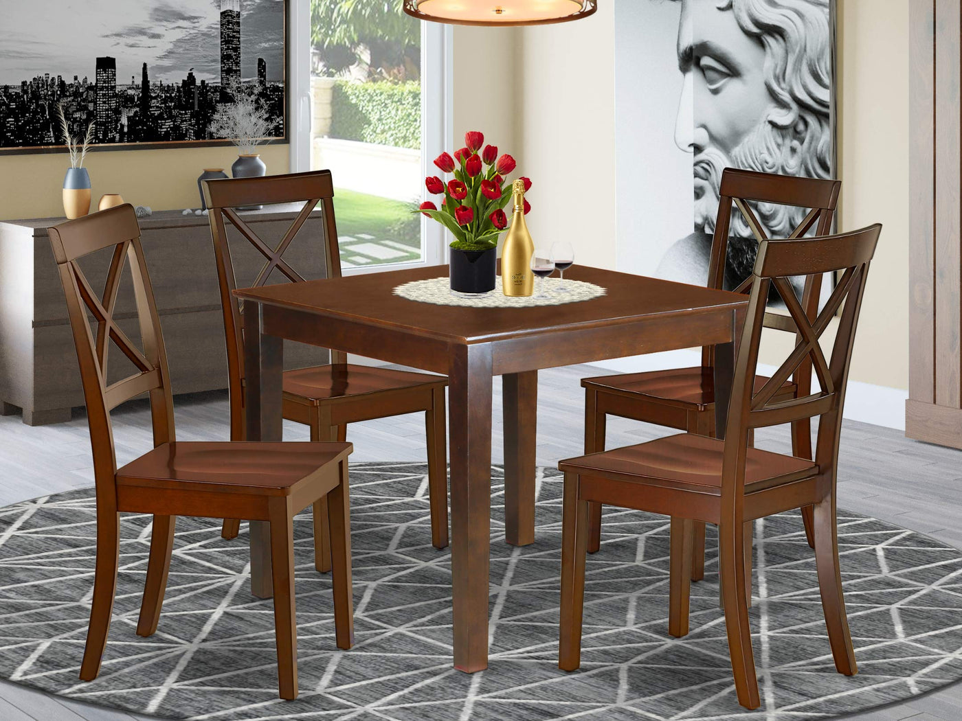 East West Furniture - Oxbo5-Mah-W - 5-Pieces Kitchen Table Setdiscover Our Exquisite 5-Pc Dining Room Table Set, Featuring A Stunning Square Wood Dining Table And 4 Top-Quality Modern Chairs. Elevate Your Dining Room'S Allure With This Captivating And Contemporary Set, Adorned With Stylish Design And Exquisite Decor. Our Inspiring Craftsmanship, Superior Quality, And Remarkable Durability Will Exceed All Expectations. The Mahogany Finish On The Table Complements Its Square Beveled Tabletop, Creating Glimmering Shadows On Its Legs With Antique Charm. Crafted Entirely From 100% Solid Wood, No Heat-Treated Pressured Wood Like Mdf, Particleboard, Or Veneer Top Is Used. The Slender X-Back Kitchen Chairs Provide Trendy And Comfortable Seating, With Smooth Mahogany-Finished Wood Seats. Stability And A Sturdy Finish Are Ensured With The Chairs' Hardwood Construction. Add Elegance And Class To Any Space With These Dining Chairs, Engineered For Optimal Comfort And Reduced Back Pain. The Matching Color Of The Chairs With The Table Brings A Pleasing Contrast To The Kitchen Area, Making It Significantly Attractive. This Contemporary, Budget-Friendly, And Durable Dining Set Promises A Great Dining Time Experience With Family And Friends.Product Features: Material: Asian Hardwood Color: Mahogany Color: Mahogany Table Dimensions: Length: 36; Width: 36; Height: 30. Chair Dimensions: Length: 21; Width: 18; Height: 38. Weight Capacity: 300 Lbsincludes: 1 Square Table And 4 Wooden Chairs.
