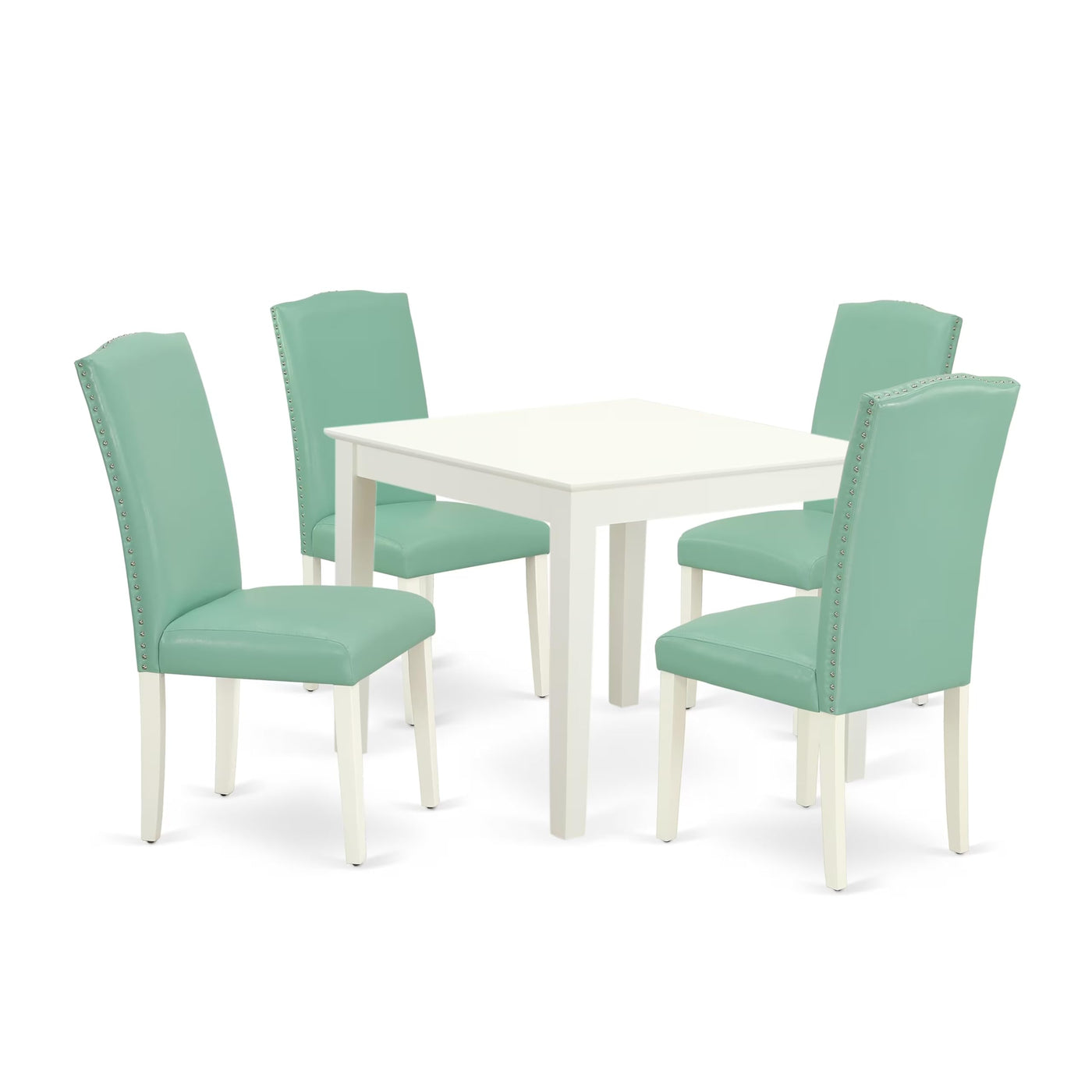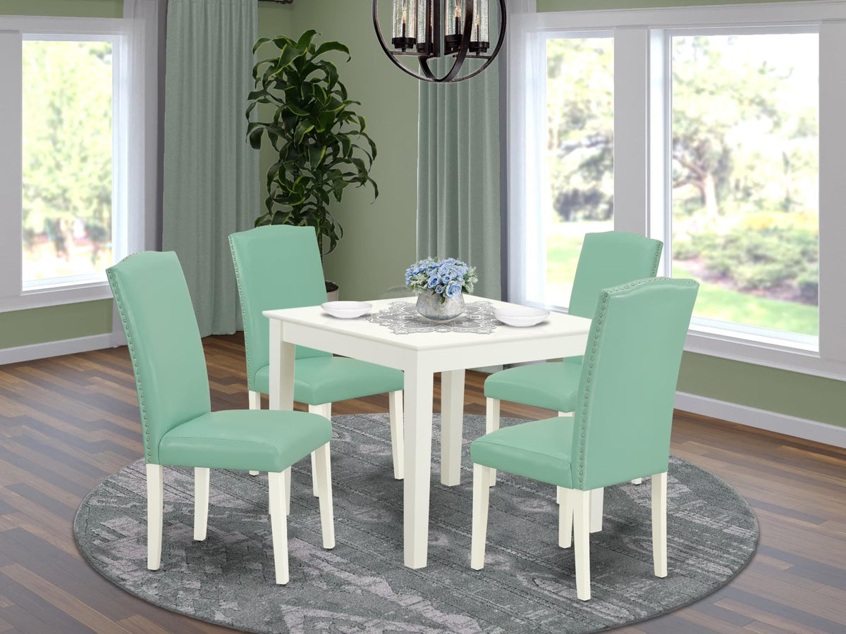 East West Furniture - Oxen5-Lwh-57 - 5-Piece Dining Setpresenting A 5-Piece Dining Room Table Set With 4 Exquisite Kitchen Chairs And A Kitchen Table, Elevating Your Dining Room Aesthetics. The Dinner Table Boasts An Elegant Table Top With Linen White Finish Legs. Accompanying It, The Dinner Chairs Have A Pond Pu Leather And Linen White Finish With Wooden 4 Legs, Exuding Sophistication. Crafted From High-Quality Asian Rubber Wood, This Set Ensures Exceptional Sturdiness. The Dining Chairs Feature A Faux Leather Seat And A Stylish Chair Back, Adding To The Overall Elegance. The Wide Seat Ensures Superior Comfort, Complementing Various Design Styles. Employing Skilled Carpenters, This Set Exudes A Luxurious Charm, Enhancing Any Dining Area. Made From 100% Solid Wood, It Guarantees Durability. The Parson Chair With A Contemporary Twist And Pu Leather-Pond Color Adds Style To Your Dining Room. Its Well-Worn Style, Arched Silhouette, And Nail Head Trim Provide Classic Character. Refresh Your Dining Space With This Elegant And Sophisticated Dining Room Set.Product Features: Material: Asian Hardwood Table Color: Linen White Fabric: Pu Leather Cushion Material: Foam Fabric Color: Pond Chair Leg Color: Linen White Chair Dimensions: Length: 24.5; Width: 19; Height: 40.5. Table Dimensions: Length: 36; Width: 36; Height: 30.Package Include: 4 Parson Chairs And A Dining Table.