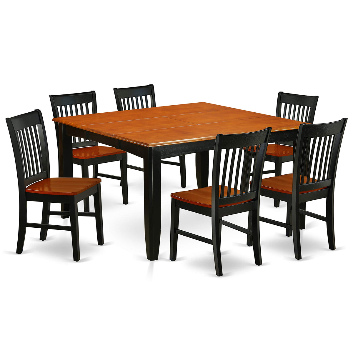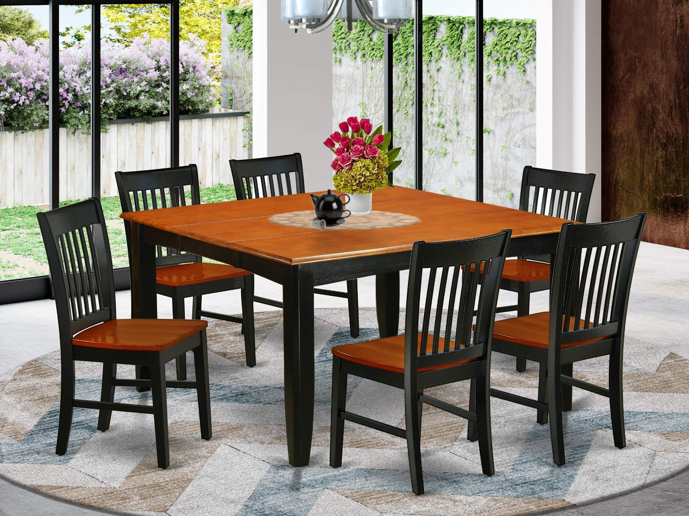 East West Furniture - Pfno7-Bch-W - Dining Room Setpresenting The 7-Piece Contemporary Dining Table Set, Complete With 6 Exquisite Dining Room Chairs And A Rectangular Dining Table Featuring A Convenient Butterfly Leaf Extension. This Ensemble Works Harmoniously To Elevate The Aesthetic Allure Of Your Dining Area. Immerse Your Dining Space In A Modernistic Essence By Seamlessly Incorporating Our Meticulously Crafted Dining Chairs And A Sophisticated Kitchen Dining Table This Exquisite Dining Set Has Been Meticulously Fashioned Using Premium Asian Rubberwood, A Material Renowned For Its Exceptional Quality. The Unparalleled Durability Of Our Dining Room Table Set Is A Direct Result Of The Exclusive Use Of This Superior Substance In Its Crafting. Importantly, None Of The Construction Integrates Heat-Treated Wood, Plywood, Veneer, Or Laminated Wood. This Exquisite Dining Set Has Been Meticulously Fashioned From Premium Asian Rubberwood, A Material Renowned For Its Exceptional Quality. The Unparalleled Durability Of Our Dining Room Table Set Is A Direct Result Of The Exclusive Use Of This Superior Substance In Its Crafting. Importantly, The Construction Of This Set Has Deliberately Avoided The Integration Of Heat-Treated Wood, Plywood, Veneer, Or Laminated Wood. The Dining Chairs Are Outfitted With Seats Crafted From Robust Hardwood, Offering An Exceptional And Ergonomically Sound Sitting Experience.Product Features: Material: Asian Hardwood Color: Black And Cherry Table Dimensions: Length: 54/36; Width: 54; Height: 30. Chair Dimensions: Length: 19; Width: 18; Height: 35. Weight Capacity: 300 Lbs.Includes: A Square Table And 6 Wooden Chairshardware Package And Instruction Manual Are Located In/Under The Seat.
