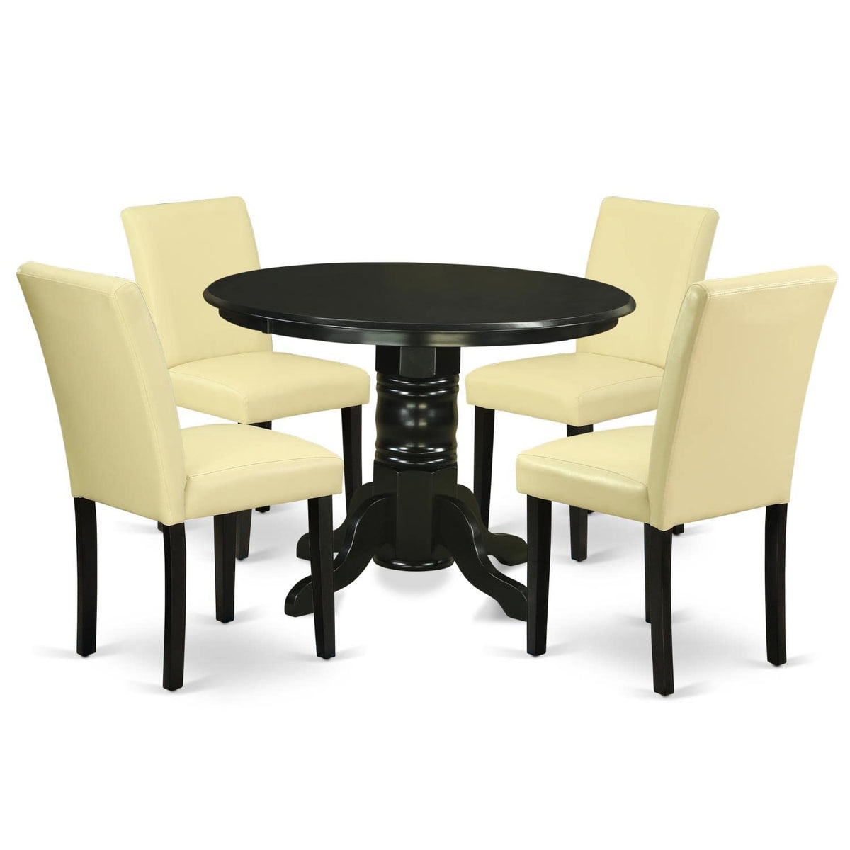 East West Furniture - Shab5-Blk-73 - 5-Piece Dining Table Setthis Meticulously Crafted 5-Piece Dining Set Showcases An Exquisite Arrangement, Featuring A Meticulously Designed Dining Table Complemented By 4 Tastefully Appointed Dining Chairs. Its Timeless And Sophisticated Aesthetics Effortlessly Harmonize With A Wide Range Of Interior Design Motifs, Seamlessly Integrating Into Existing Decor Schemes. The Kitchen Table Within Our Collection Presents An Exquisite Wire-Brushed Black Finish On Its Tabletop, Seamlessly Harmonizing With The Impeccably Crafted Wire-Brushed Black-Finished Legs. In Perfect Alignment, Our Modern Dining Chairs Feature Seats Elegantly Upholstered In Eggnog Pu Leather, Their Grace Supported By Four Meticulously Finished Wire-Brushed Black Wooden Legs. Our Contemporary Dining Table Set Exemplifies Superior Craftsmanship, Meticulously Fashioned From The Finest Asian Rubber Wood Known For Its Unparalleled Sturdiness And Longevity. The Adept Hands Of Our Highly Skilled Artisans Have Meticulously Sculpted This Mid-Century Dining Set, Exuding An Aura Of Lavish Sophistication That Flawlessly Complements Diverse Dining Room Aesthetics. These Mid-Century Modern Dining Chairs Boasting A Refined Faux Leather Seat And An Elegantly Styled Chair Back That Truly Elevate The Aesthetic Of The Kitchen Space. The Inclusion Of A Spacious Seat Ensures An Enhanced Level Of Comfort For Users.Product Features: Material: Asian Hardwood Color: Black Fabric: Pu Leather Cushion Material: Foam Fabric Color: Eggnog Table Dimensions: Length: 42; Width: 42; Height: 30. Chair Dimensions: Length: 22; Width: 17.20; Height: 35.20. Weight Capacity: 300 Lbs.Includes: 1 Round Table And 4 Parson Chairs.