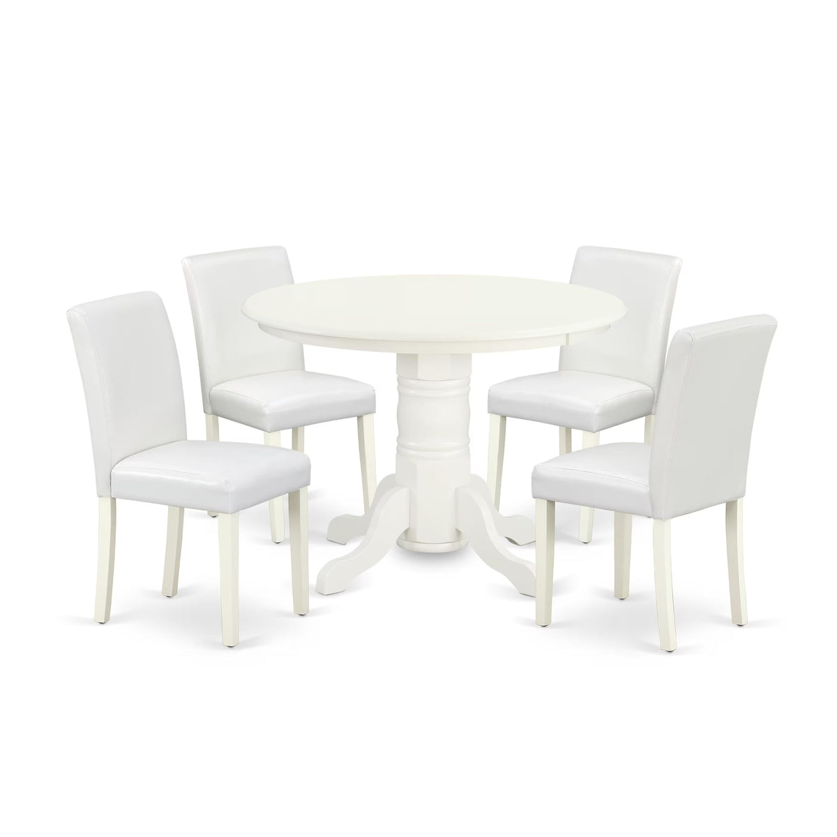 East West Furniture - Shab5-Lwh-64 5-Piece Dining Table Setenhance Your Culinary Space With Our Meticulously Crafted 5-Piece Kitchen Table Set. This Exquisite Ensemble Includes A Gracefully Designed Round Pedestal Dining Table And 4 Exquisitely Tailored Kitchen Chairs. The Set Embodies A Timeless Sense Of Sophistication, Seamlessly Complementing A Range Of Interior Motifs. This Dining Table Presents A Sophisticated Design Aesthetic, Highlighted By Its Linen White Tabletop That Harmonizes Seamlessly With The Legs, Also Impeccably Finished In The Same Understated Hue. The Upholstered Chairs We Offer Strike A Perfect Balance Between Comfort And Style, With Seats Clad In White Pu Leather And Gracefully Supported By Meticulously Crafted Wooden Legs. This Sophisticated Dining Table Set Is Skillfully Constructed Utilizing Premium Asian Timber, Notably Recognized As Rubberwood. Each Leg Is Thoughtfully Outfitted With Anti-Slip Protectors To Ensure The Preservation Of Your Flooring, Effectively Mitigating Any Potential For Inadvertent Scratches. The Parson Chairs Are Distinguished By Their Refined Faux Leather Seats And Elegant Chair Backs, Contributing To An Elevated Aesthetic Within The Kitchen Area. Additionally, The Generously Proportioned Seat Design Enhances Comfort Levels Significantly. These Upholstered Dining Chairs Demonstrate Remarkable Versatility, Adeptly Complementing A Variety Of Design Aesthetics And Imparting A Sense Of Sophistication To Any Room.Product Features: Material: Asian Hardwood Color: Linen White Fabric: Pu Leather Cushion Material: Foam Table Dimensions: Length: 42; Width: 42; Height: 30. Chair Dimensions: Length: 22; Width: 17.20; Height: 35.20. Weight Capacity: 300 Lbs.Includes: 1 Round Table And 4 Parson Chairs.