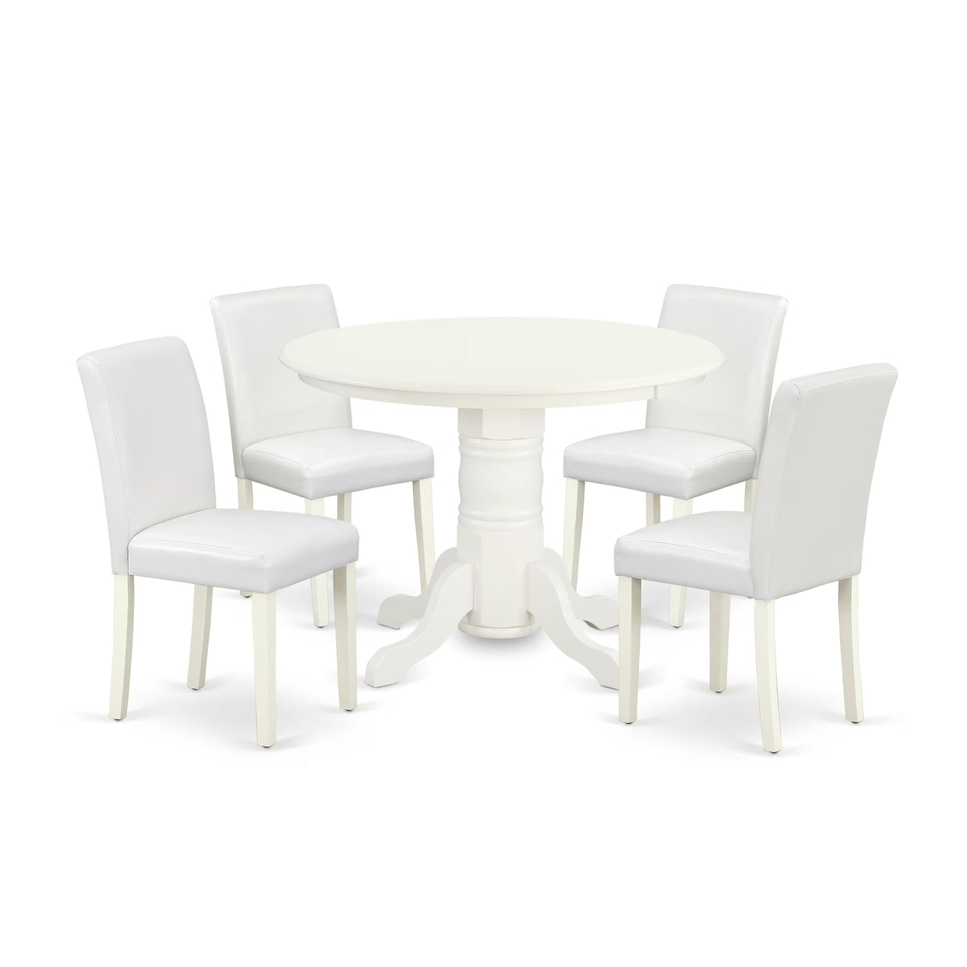 East West Furniture Shab5-Lwh-64 5 Piece Dining Set Includes A Round Kitchen Table With Pedestal And 4 White Faux Leather Parsons Dining Chairs, 42X42 Inch, Linen White