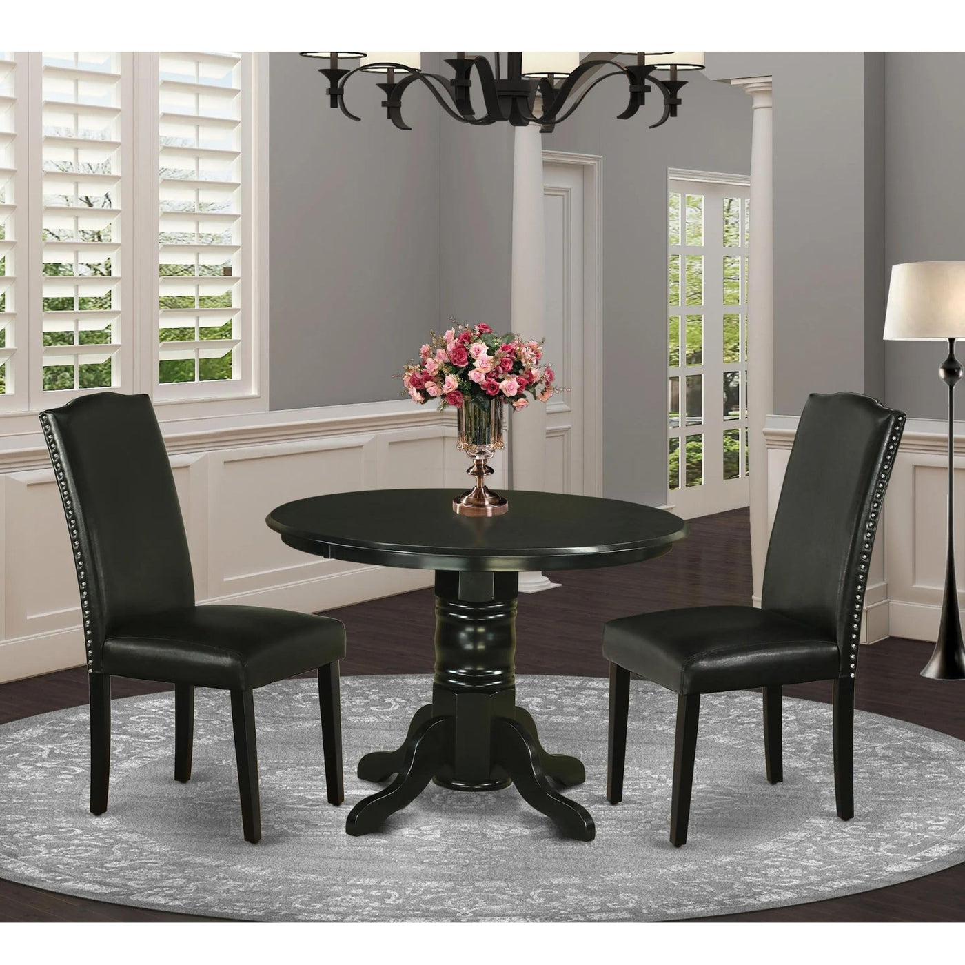 East West Furniture - - Shen3-Blk-69 3-Piece Dining Table Setcomprising A 3-Piece Dining Table Set Ensemble This Includes A Single Round Pedestal Dining Table And 2 Intricately Designed Dining Room Chairs. These Elements Collectively Evoke A Sense Of Refined Classicism For Any Residence. Noteworthy For Their Versatile Nature, These Pieces Exhibit A Traditional Design That Seamlessly Complements A Diverse Range Of Pre-Existing Decor Schemes. Introducing Our Exquisite Mid-Century Modern Dining Table Distinguished By Its Exceptional Craftsmanship And Design Elements. The Table Features A Wire Brushed Black Tabletop That Perfectly Complements The Sophistication Of Wire Brushed Black-Finished Legs, Creating A Harmonious Fusion Of Style And Quality. Our Meticulously Designed Dining Table Set Showcases The Use Of Top-Tier Asian Wood, Renowned As Rubberwood In The Industry. To Provide Enhanced Floor Protection, We'Ve Thoughtfully Incorporated Anti-Slip Protectors Beneath Each Leg. The Meticulous Wood Selection Process, Paired With Impeccable Craftsmanship, Exemplifies The Dedicated Care Devoted To Perfecting Every Piece Within This Exquisite Dining Room Table Set. The Dining Chairs Are Appointed With Seats Crafted From Premium Faux Leather, Accompanied By Tastefully Designed Chair Backs That Elevate The Overall Refinement Of The Kitchen Area. The Expansive Seating Area Not Only Contributes To Elevated Comfort But Also Ensures A Thoroughly Accommodating Experience.Product Features: Material: Asian Hardwood Color: Black Fabric: Pu Leather Cushion Material: Foam Table Dimensions: Length: 42; Width: 42; Height: 30. Chair Dimensions: Length: 24.5; Width: 19; Height: 40.5. Weight Capacity: 300 Lbs.Includes: 1 Round Table And 2 Parson Chairs.
