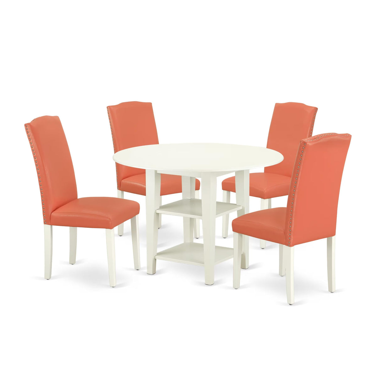 East West Furniture - Suen5-Lwh-78 - 5-Piece Dining Table Setour Meticulously 5-Piece Contemporary Dining Table Set Includes 4 Exquisite Dining Chairs And An Elegant Kitchen Table. Elevate The Overall Aesthetic Of Your Dining Space By Integrating Our Premium Dining Room Chairs And Table Creating A Modern And Professionally Curated Environment. Our Exquisite Dining Table Features A Sophisticated Linen White Tabletop Expertly Matched With Elegantly Finished Linen White Legs. The Upholstered Chairs Are Adorned With Pink Flamingo Pu Leather Seats And Supported By Four Meticulously Crafted Wooden Legs All Impeccably Finished In Linen White. The Modern Dining Table Set Is Meticulously Crafted From High-Quality Asian Rubber Wood, Renowned For Its Exceptional Durability And Resilience. This Exquisite Dining Ensemble Is Expertly Designed And Manufactured By Highly Experienced Carpenters, Adding A Touch Of Luxurious Elegance To Any Dining Room. These Dining Chairs Are Crafted With High-Quality Faux Leather For Their Seats And Feature A Stylish Chair Back, Elevating The Overall Aesthetic Of Your Kitchen. Additionally, Their Generous Seating Area Is Designed For Optimal Comfort. These Mid-Century Dining Chairs Effortlessly Complement A Wide Range Of Design Aesthetics, Seamlessly Integrating Into Any Decor Style And Imparting A Refined Sense Of Sophistication To Any Room.Product Feature: Material: Asian Hardwood Color: Linen White Fabric: Pu Leather Cushion Material: Foam Fabric Color: Pink Flamingo Table Dimensions: Length: 42; Width: 42; Height: 29.5. Chair Dimensions: Length: 24.5; Width: 19; Height: 40.5. Weight Capacity: 300 Lbs.Includes: 1 Round Table And 4 Parson Chairs.