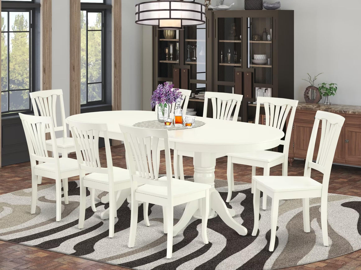 East West Furniture - Vaav9-Lwh-W - Dining Room Setour Meticulously Designed 9-Piece Dining Set Comprises A Butterfly Leaf Dining Table And 8 Perfectly Coordinated Kitchen Chairs. This Elegant Oval Double-Pedestal Kitchen Table Ensemble Not Only Elevates Your Dining Or Kitchen Ambiance But Also Exudes Refinement And Comfort. It Serves As The Ultimate Gathering Spot For Family And Friends, Offering Elevated Elegance And Conviviality. Crafted With Precision, The Linen White Finish Seamlessly Extends From Tabletop To Double Pedestal Legs, Complementing Various Decor Styles. The Dining Chairs, Featuring Linen White-Finished Wooden Legs, Seamlessly Blend With Comfortable Wooden Seats. Crafted From Premium Asian Rubber Wood, Known For Its Density And Durability, This Eco-Friendly Wood Ensures Longevity, Making It A Durable Investment. Notably, We Avoid Heat-Treated Wood, Plywood, Veneer, Or Laminated Wood In This Ensemble'S Construction. The Wooden Dining Chairs Boast Stylish Wooden Seats, Enhancing Overall Aesthetics. Their Spacious Seating Area Adds Comfort, While The Well-Crafted Back Design Suits Diverse Decor Styles, From Rustic To Contemporary. A Standard Shape, Size, And Design Make The Dining Area Significantly More Attractive.Product Features: Material: Asian Hardwood Color: Linen White Table Dimensions: Length: 76.3/59; Width: 40; Height: 30. Chair Dimensions: Length: 22; Width: 18; Height: 36. Weight Capacity: 300 Lbs.Includes: An Oval Table And 8 Wooden Chairshardware Package And Instruction Manual Are Located In/Under The Seat.